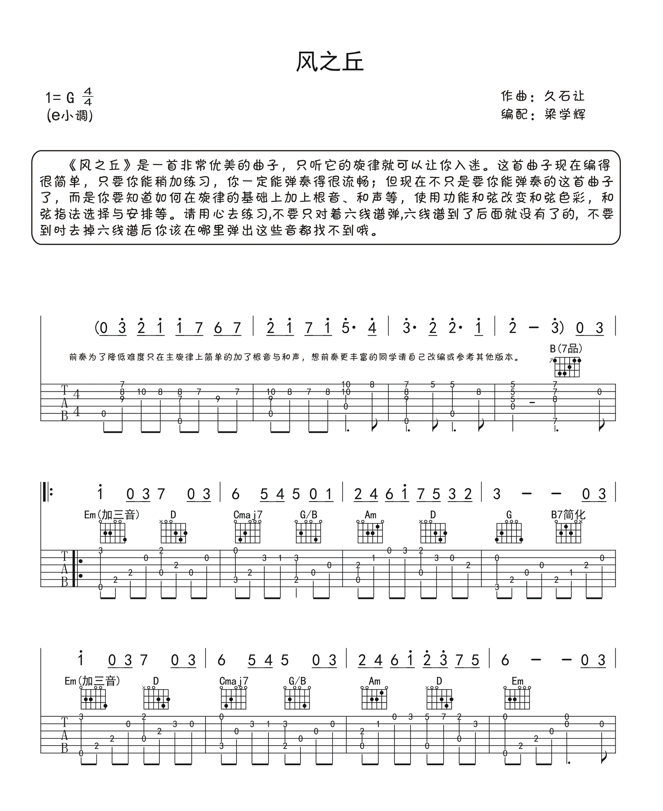 吉他久石让《风之丘》吉他谱_吉他弹唱谱_梁学辉编配