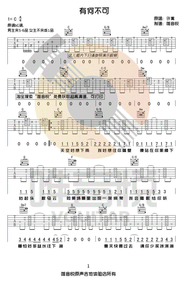 吉他许嵩《有何不可》吉他谱_吉他弹唱谱_唯音悦编配