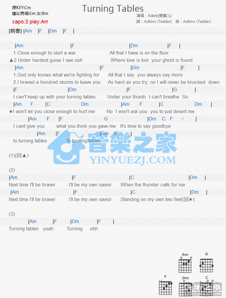 Am调版《TurningTables》吉他和弦弹唱谱...