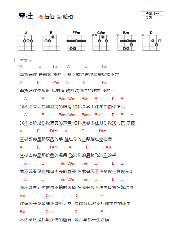 吉他伍佰《牵挂》吉他谱_吉他弹唱谱