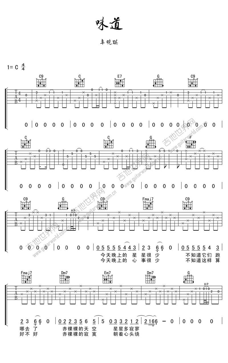 辛晓琪味道吉他谱,C调指法编配,味道六线谱,图片谱格式。在《味道》这首歌里,辛晓琪细致入微地唱出了女人对于爱情的种种相思,恋爱中留下的痕迹和味道,让记忆和味道深深的留在那份伤心之处,给人感觉上最大的触动。辛晓琪歌曲《味道》吉他弹唱谱,推荐收藏。...