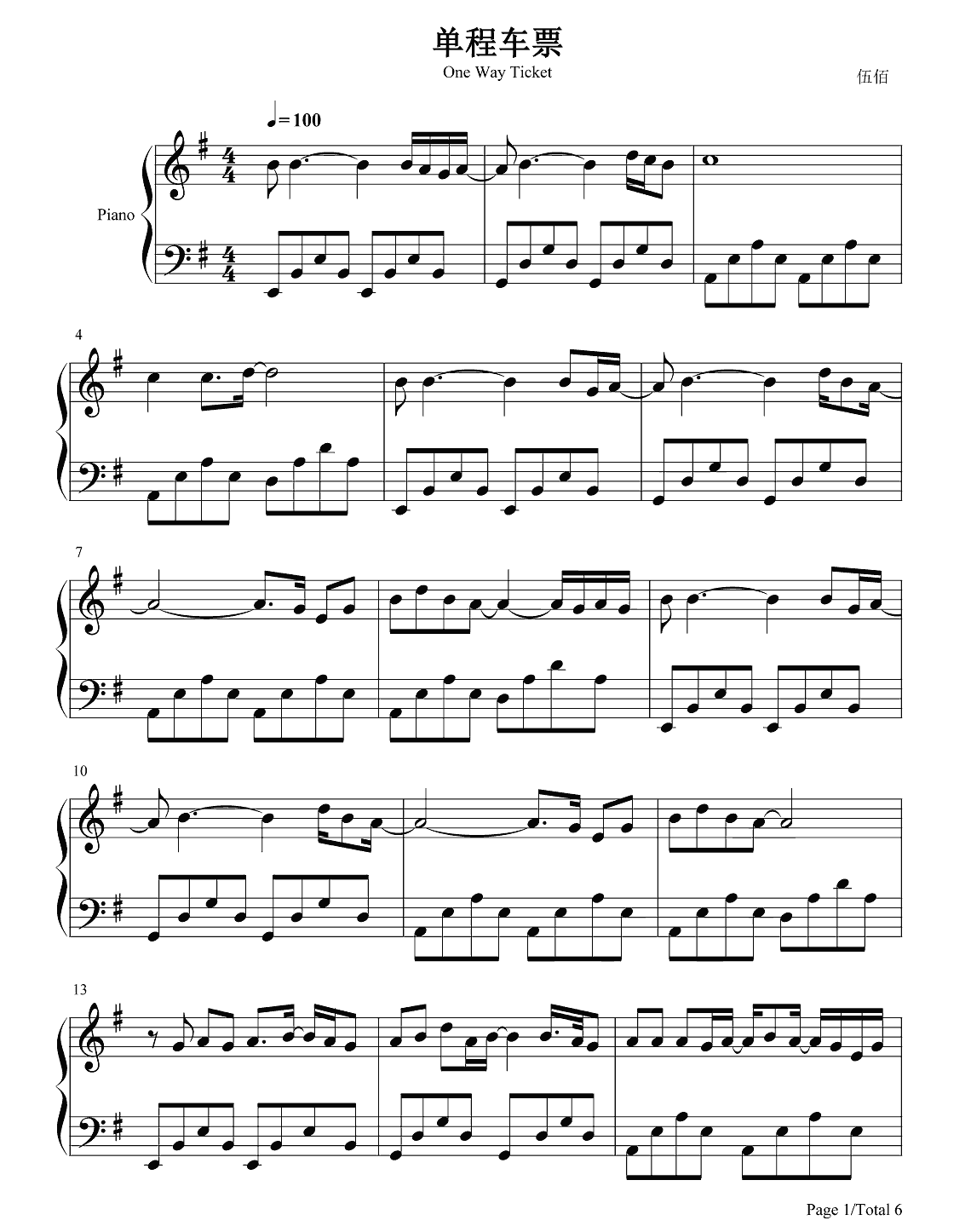 伍佰《单程车票》钢琴谱...