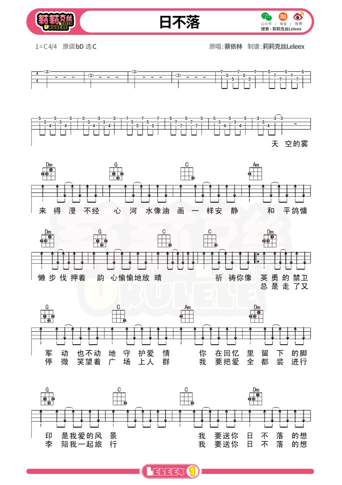 尤克里里蔡依林《日不落》尤克里里弹唱曲谱(标准四线谱)莉莉克丝Leleex