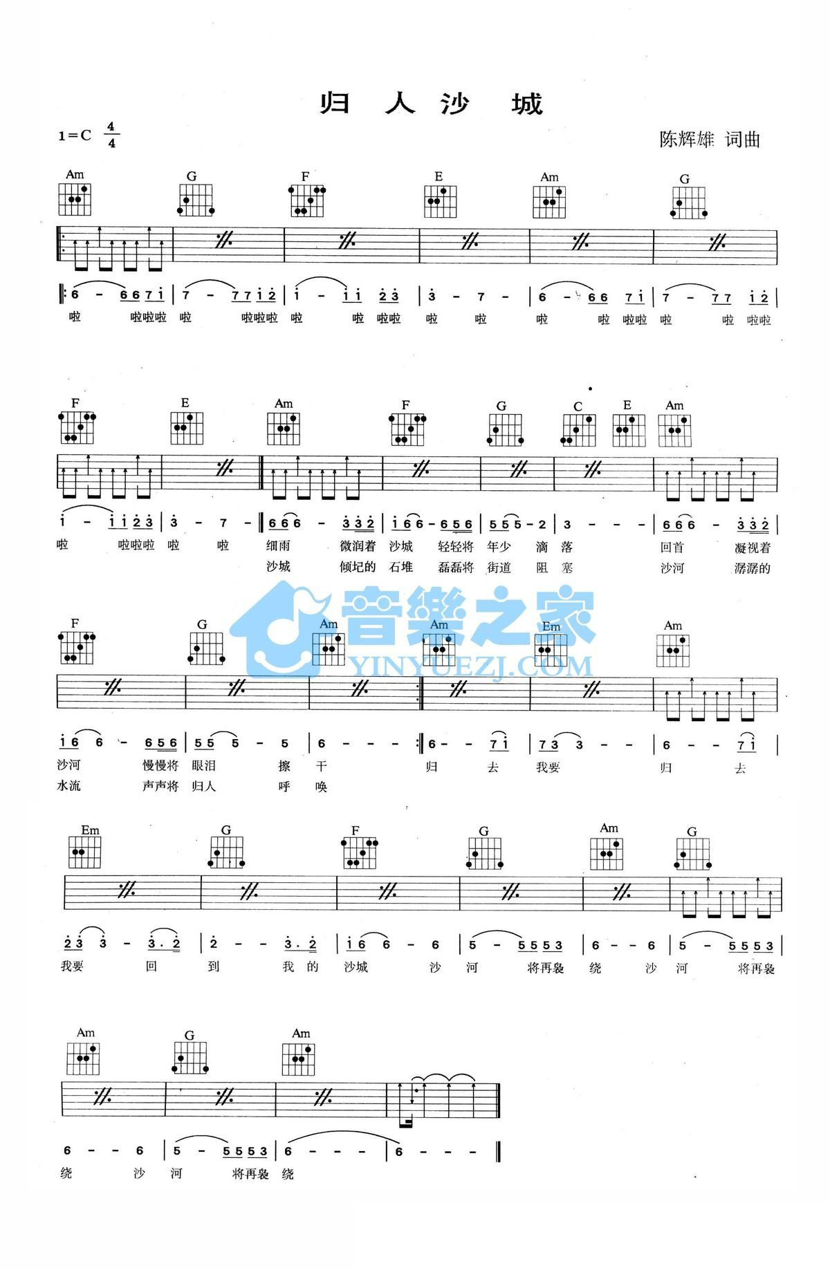 C调版施孝荣《归人沙城》吉他弹唱六线谱...