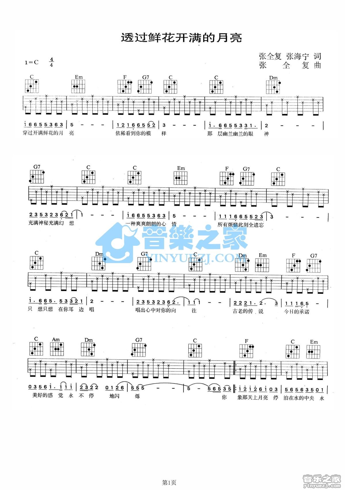 C调版林依轮《透过鲜花开满的月亮》吉他弹唱六线谱...