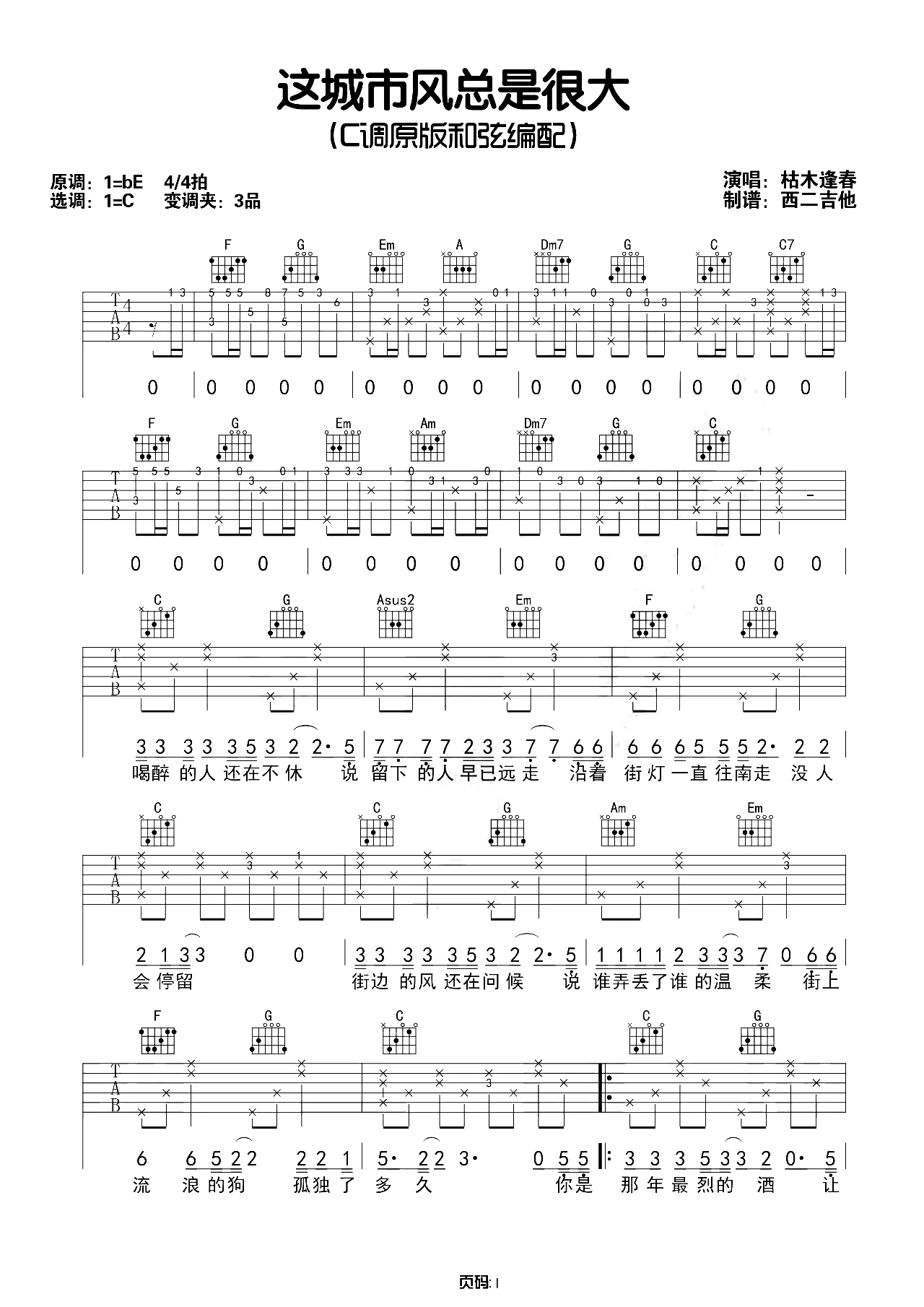 这城市风总是很大吉他谱,歌曲原调bE调,4/4拍,编配的时候采用C调原版和弦编配,弹奏时候变调夹夹3品,来曲谱来自西二吉他制谱,附上弹唱示范演示视频。这城市风总是很大弹唱六线谱,枯木逢春演唱歌曲。 平淡的词,无数次的情感倾诉。这城市风总是很大,等不到一人陪我回家。生活的无奈,...