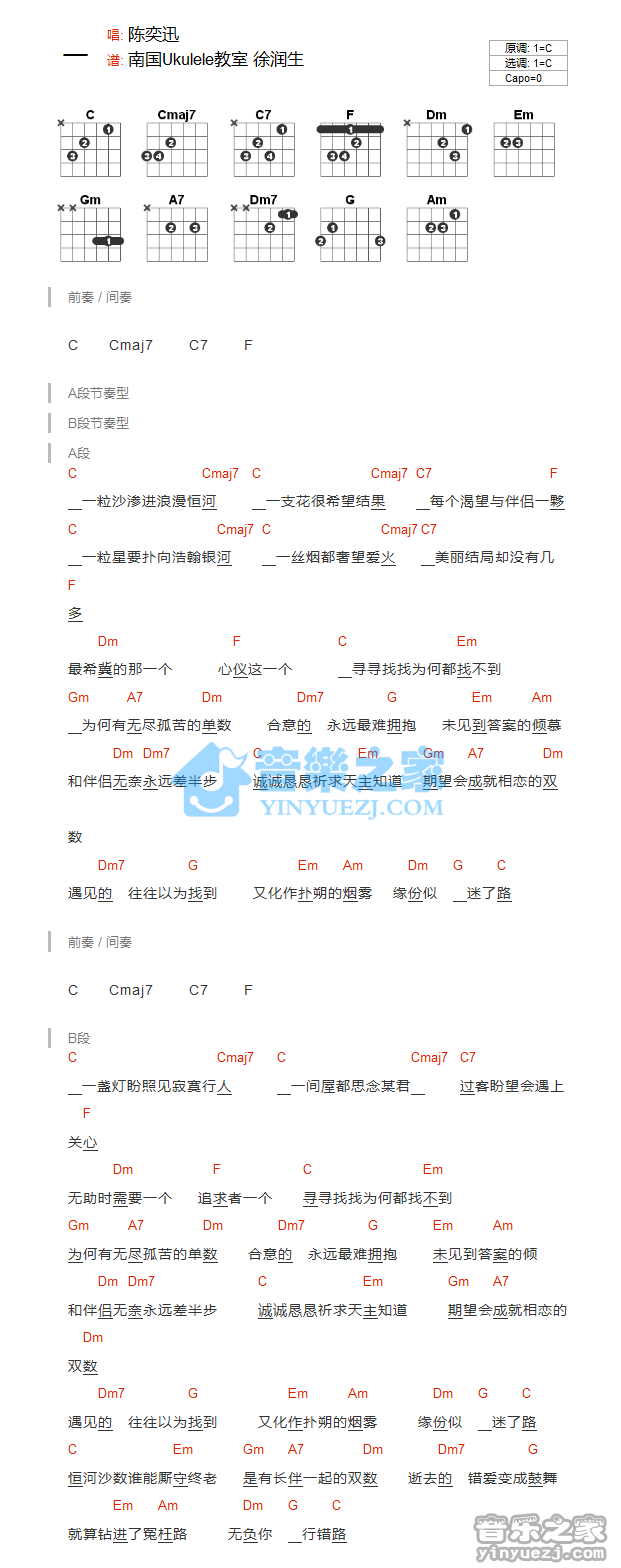 C调版陈奕迅《一》吉他和弦弹唱谱...