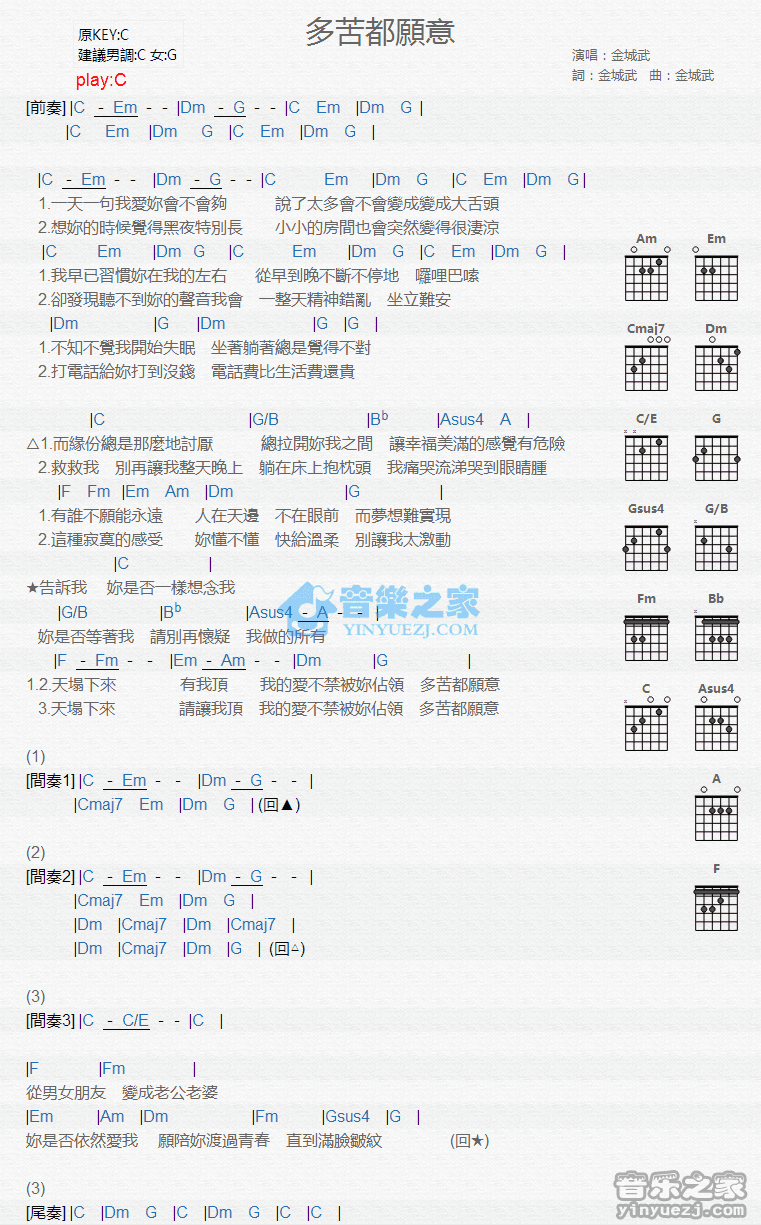 吉他金城武《多苦都愿意》吉他谱_吉他弹唱谱_YYZJ编配
