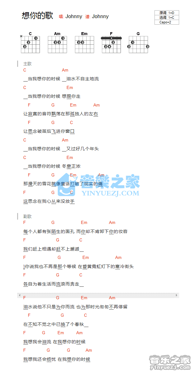 吉他Johnny《想你的歌》吉他谱_吉他弹唱谱_YYZJ编配