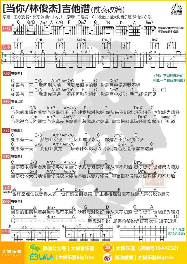 林俊杰《当你》吉他谱,大树音乐屋编配出品,共有1张高清图谱,免翻页排版设计。...