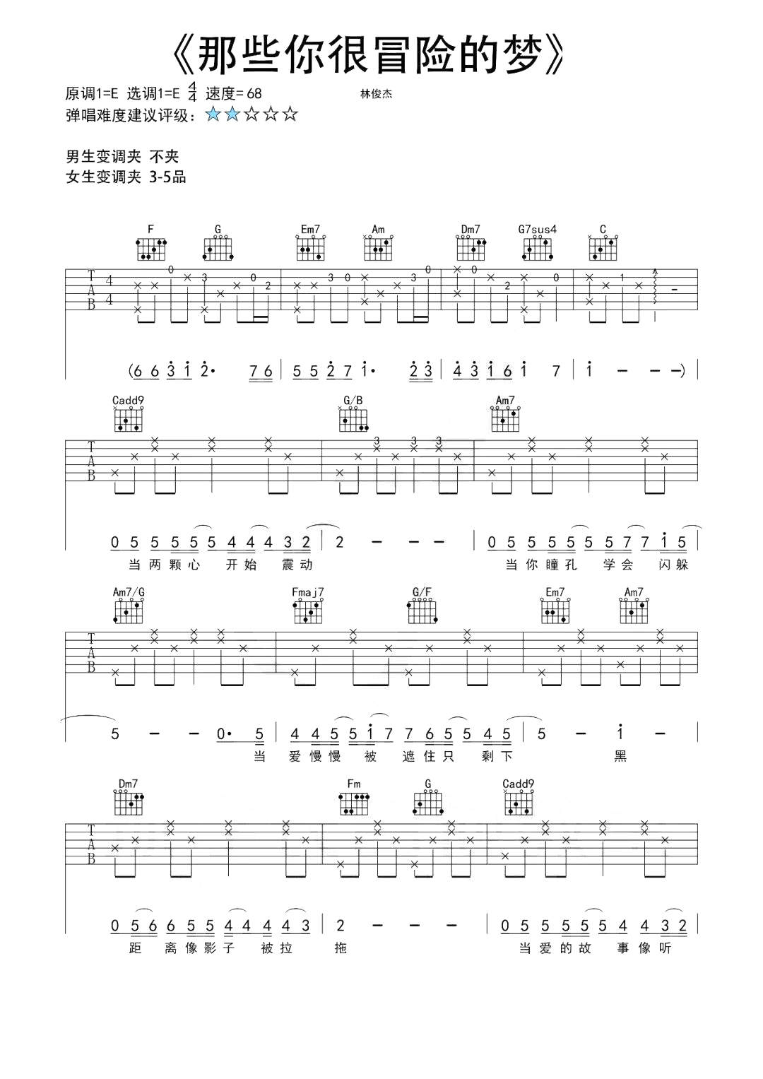 林俊杰《那些你很冒险的梦》吉他谱,孙学长吉他教室编配出品,共有3张高清图谱。...