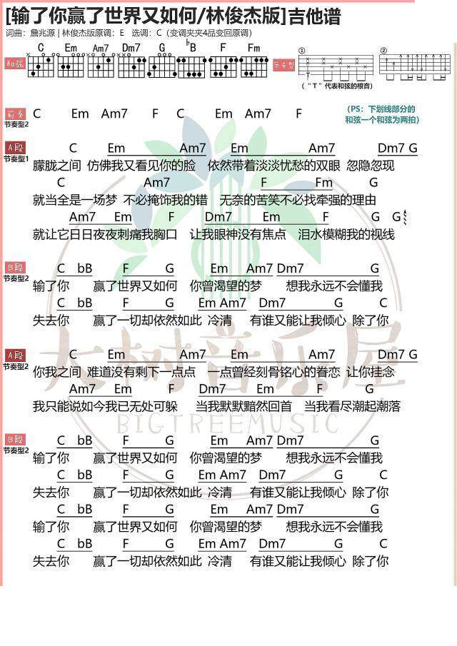 林俊杰《输了你赢了世界又如何》吉他谱,共有1张高清图谱,免翻页排版设计。...