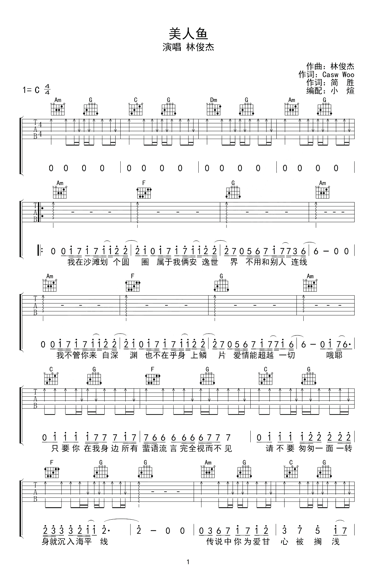 林俊杰《美人鱼》吉他谱,山山吉他编配出品,共有2张高清图谱,免翻页排版设计。...