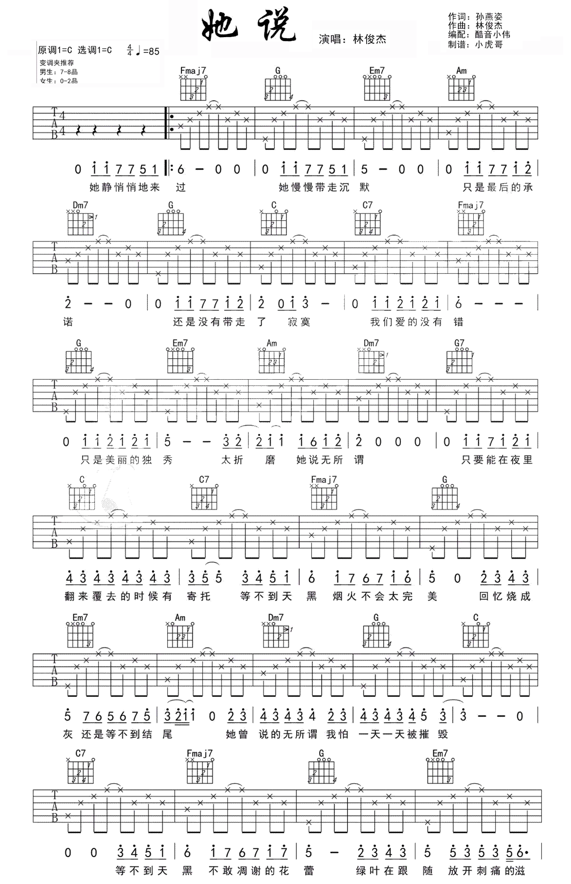 变调夹推荐,男生7-8品,女生0-2品,她说六线谱,旋律透彻心底,歌声干净纯粹,JJ这首经典情歌《她说》深情细腻,淡淡的忧伤述说委婉的情感,触动每一颗心灵。...