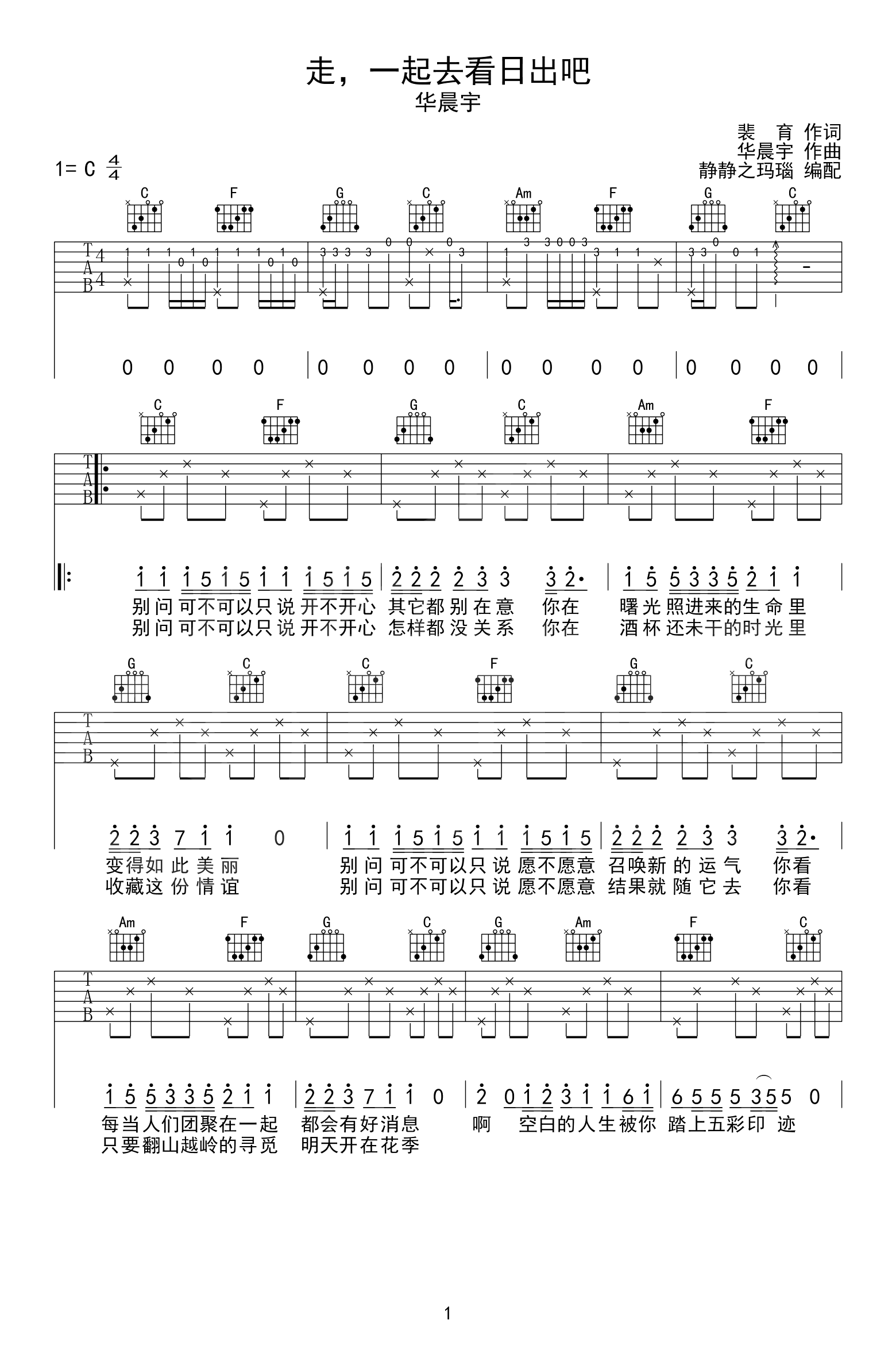 走,一起去看日出吧吉他谱_华晨宇_C调弹唱_高清六线谱...