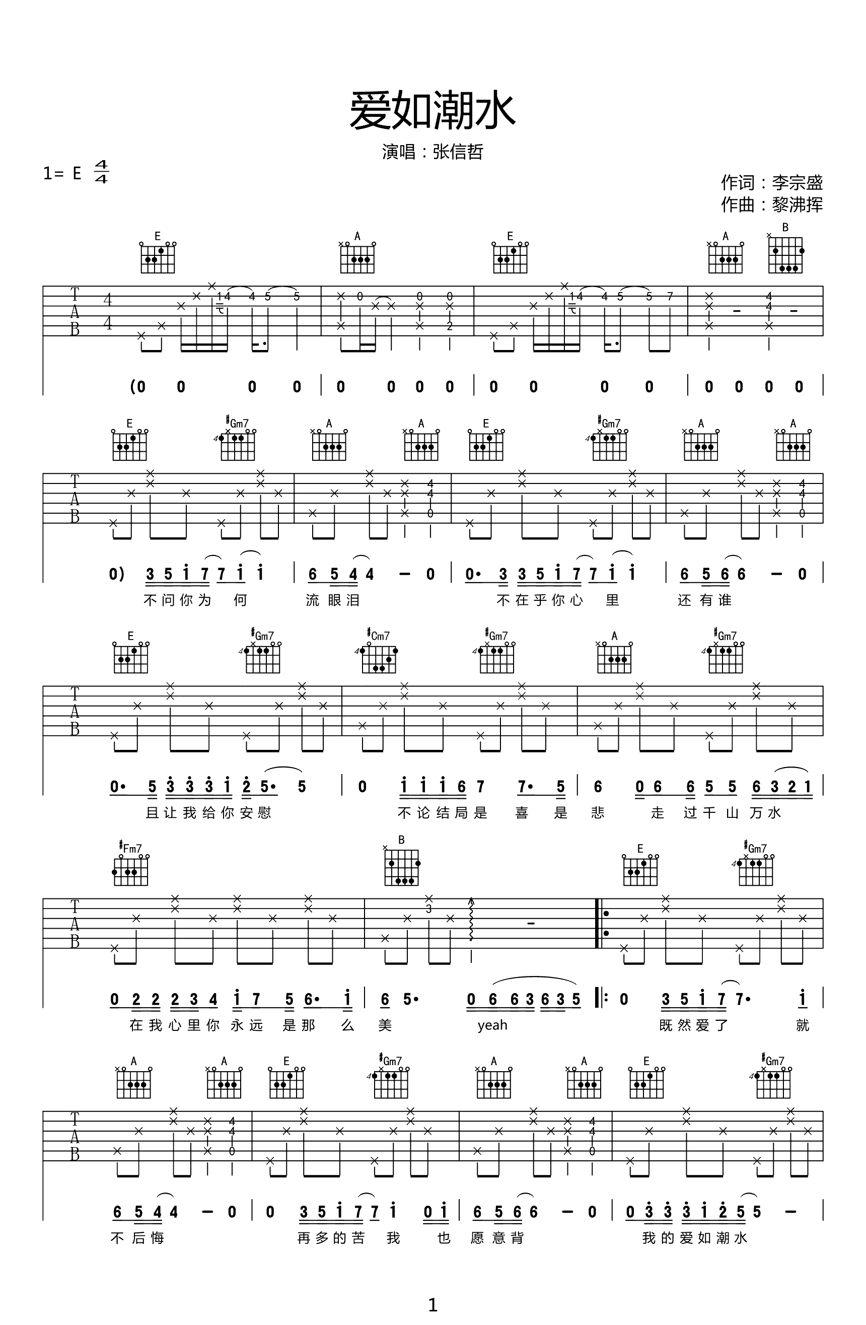 爱如潮水吉他谱_E调弹唱谱_张信哲_高清六线谱...