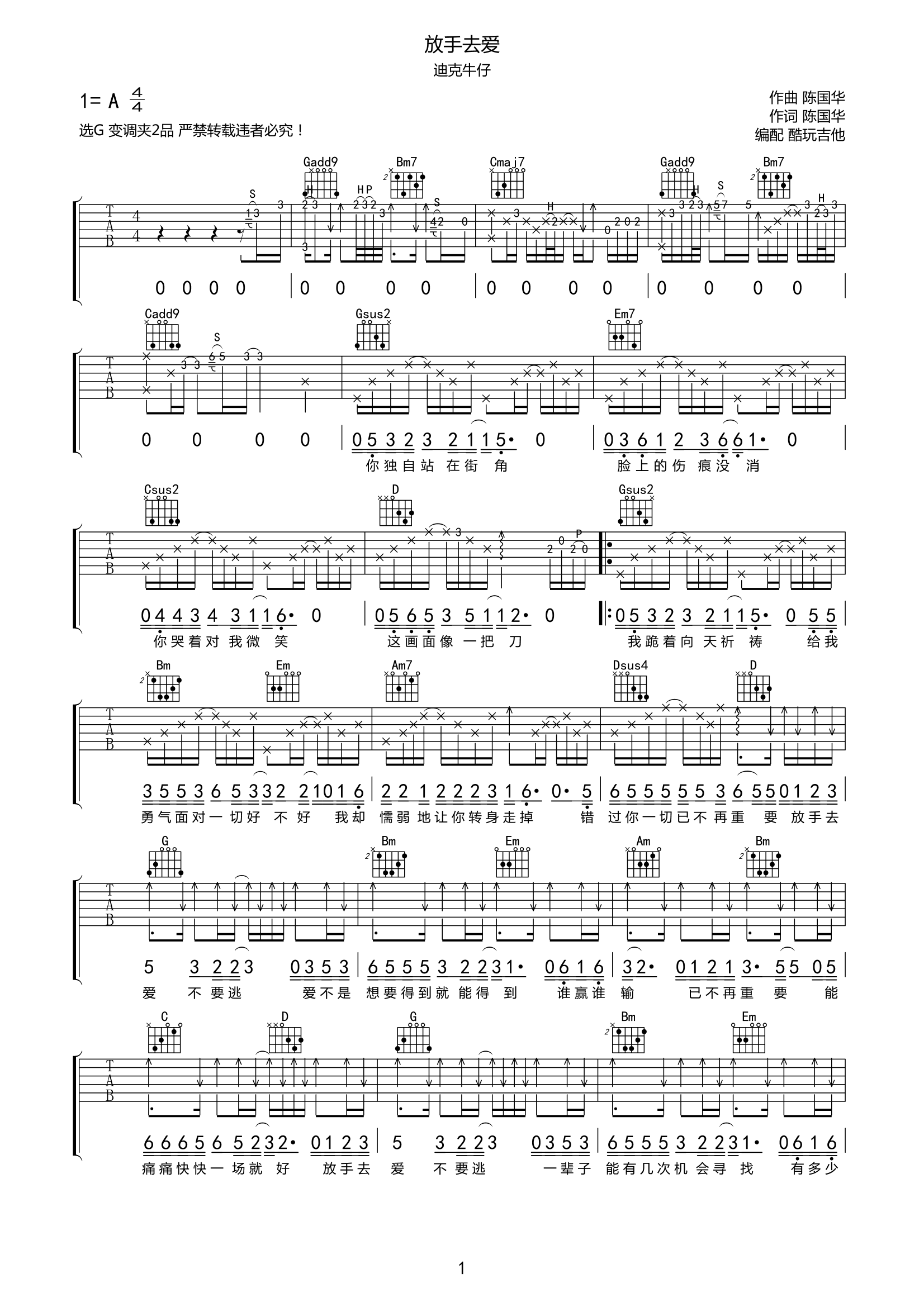 吉他迪克牛仔《放手去爱》吉他谱-G调弹唱谱高清原版谱