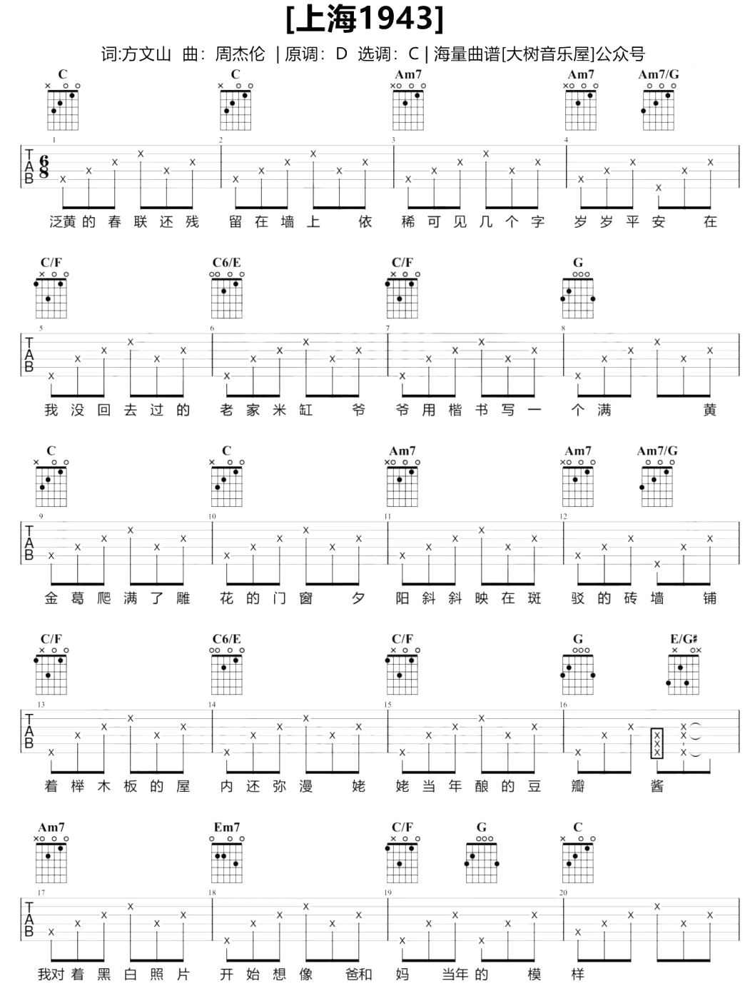 吉他上海1943吉他谱_周杰伦_C调弹唱谱