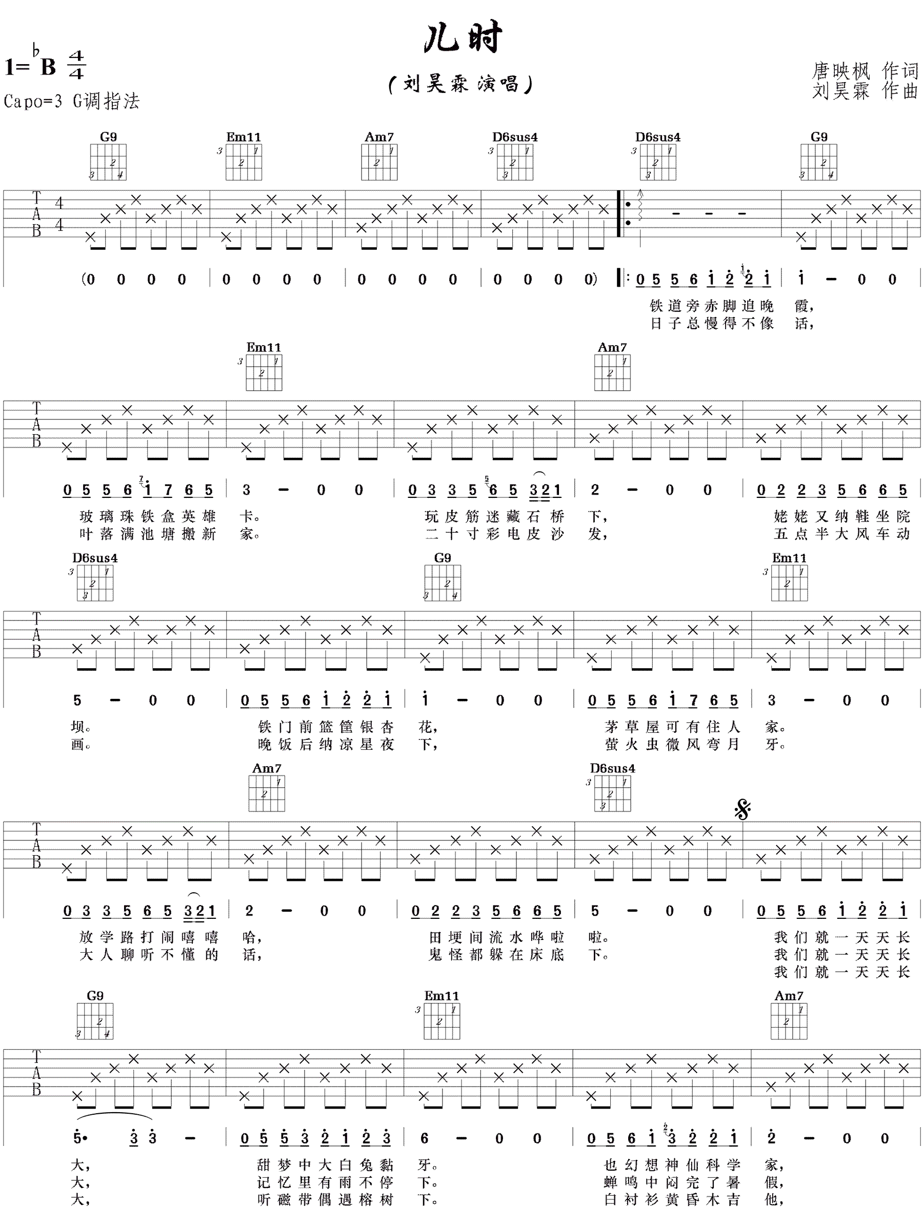儿时吉他谱刘昊霖G调指法吉他弹唱谱...