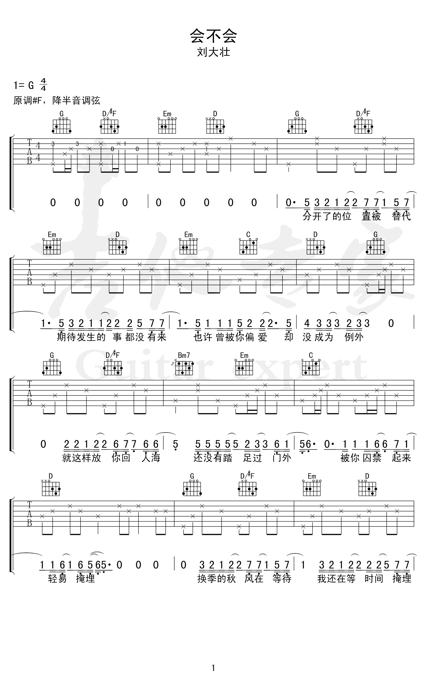 会不会吉他谱_G调_刘大壮_吉他弹唱谱_高清六线谱...