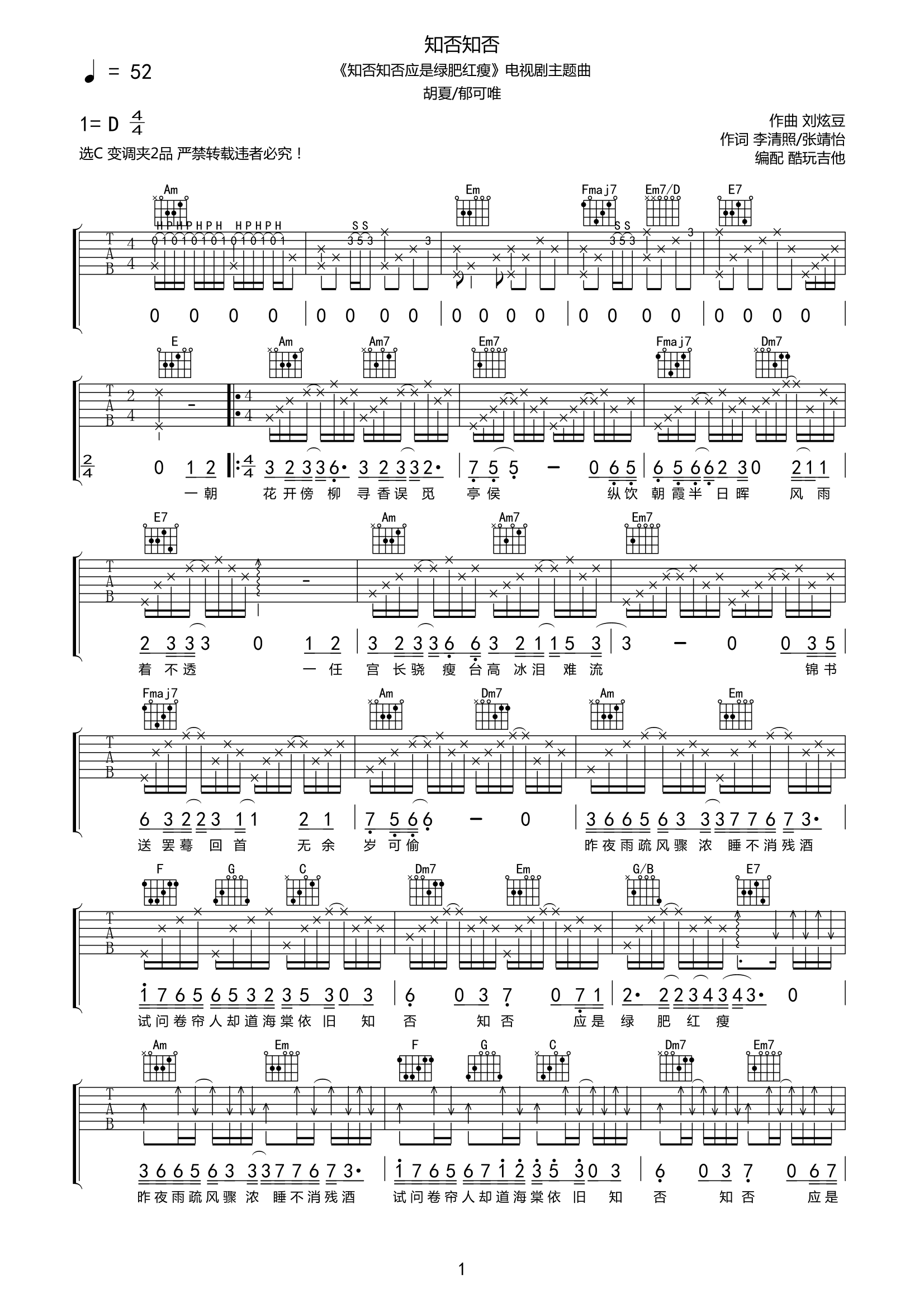 郁可唯胡夏《知否知否》吉他谱-C调弹唱谱高清完整原版免翻页翻页...