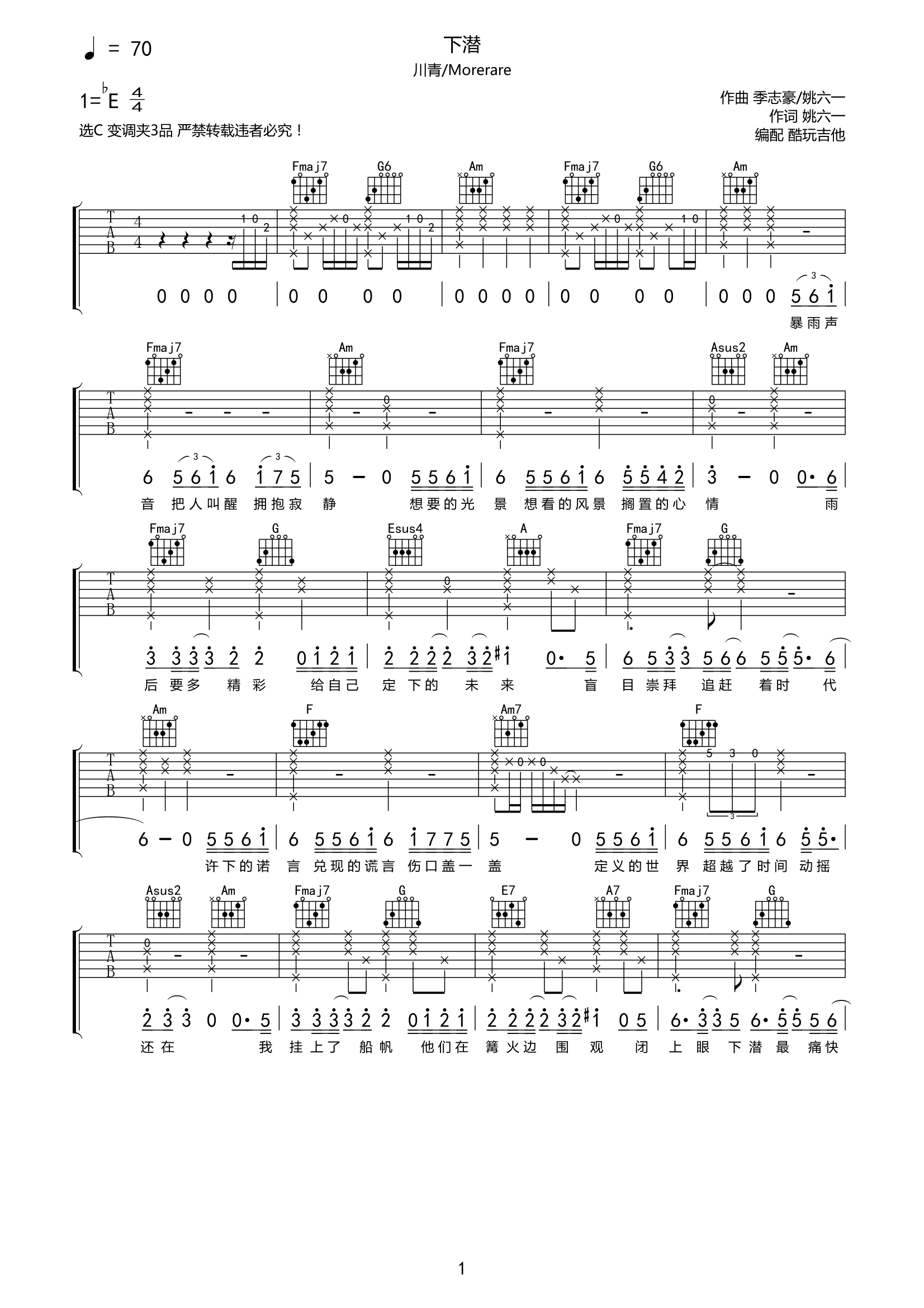 吉他川青/Morerare《下潜》吉他谱-C调弹唱谱高清原版