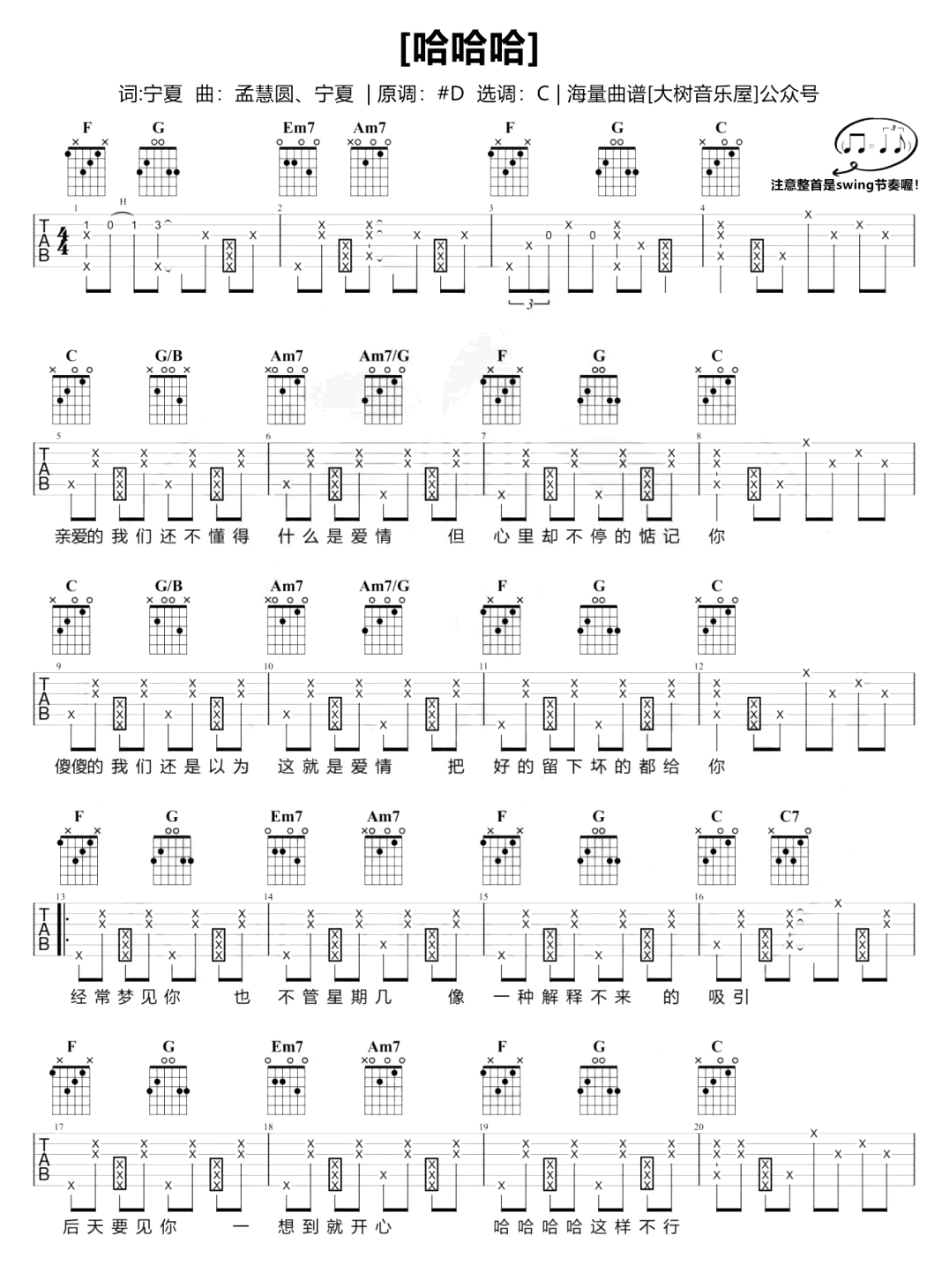 哈哈哈吉他谱_孟慧圆_C调弹唱谱...