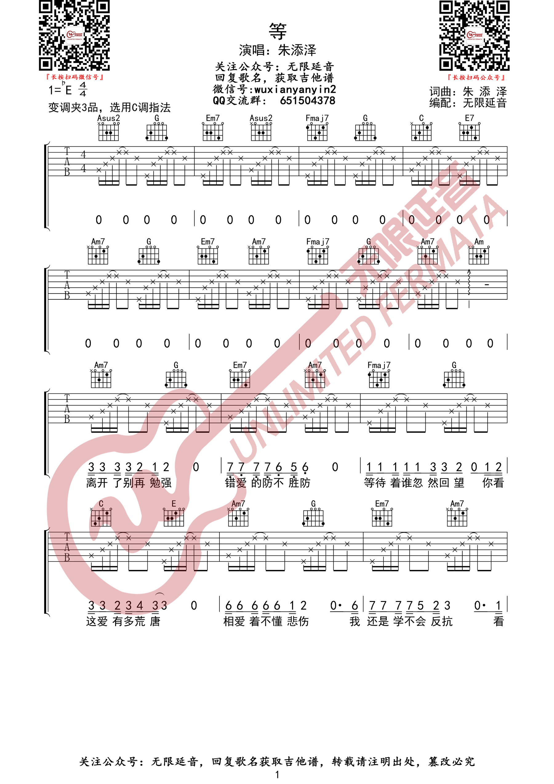 吉他朱添泽《等》吉他谱 C调原版弹唱谱
