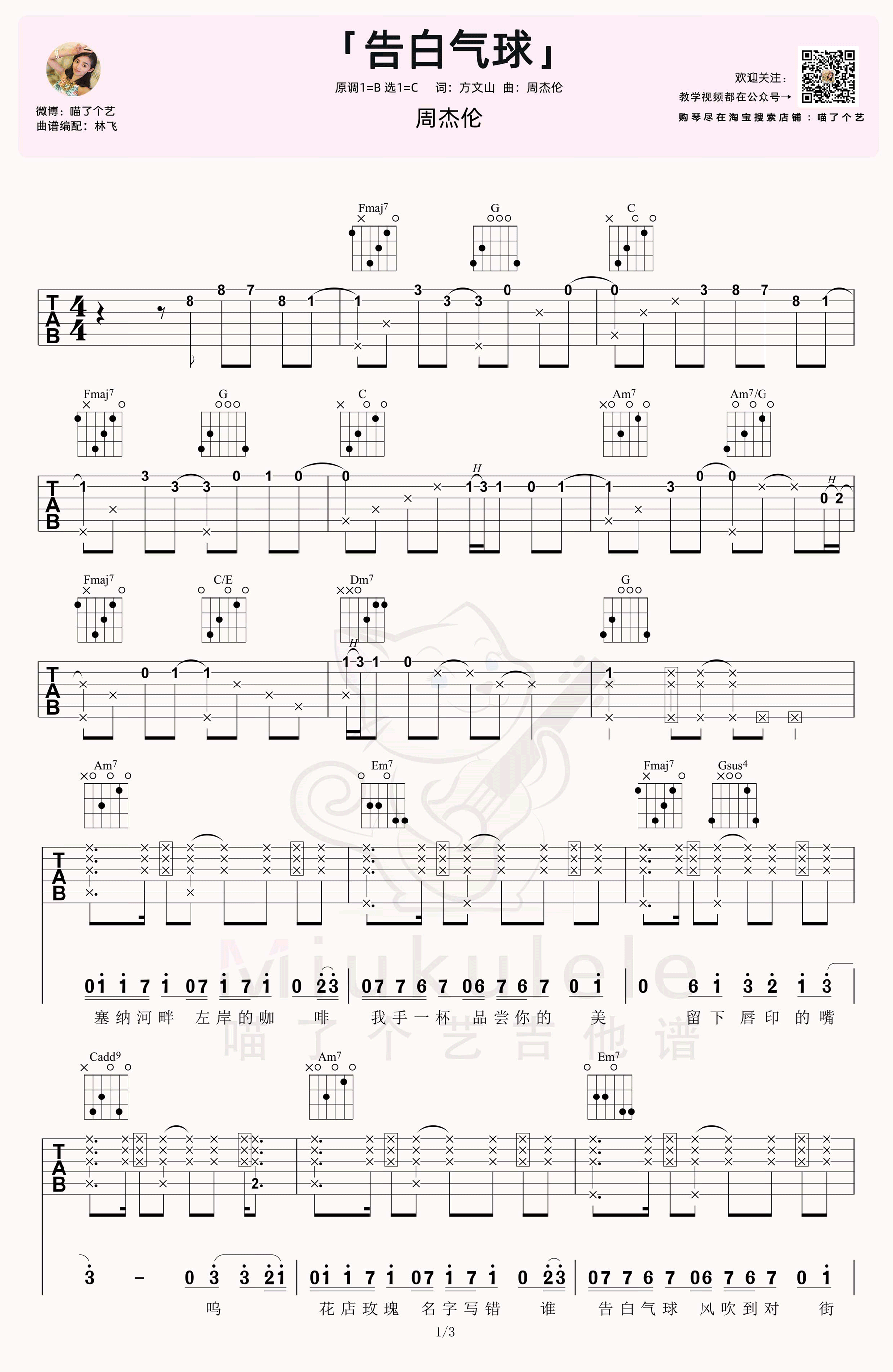 周杰伦《告白气球》吉他谱C调原版六线谱...