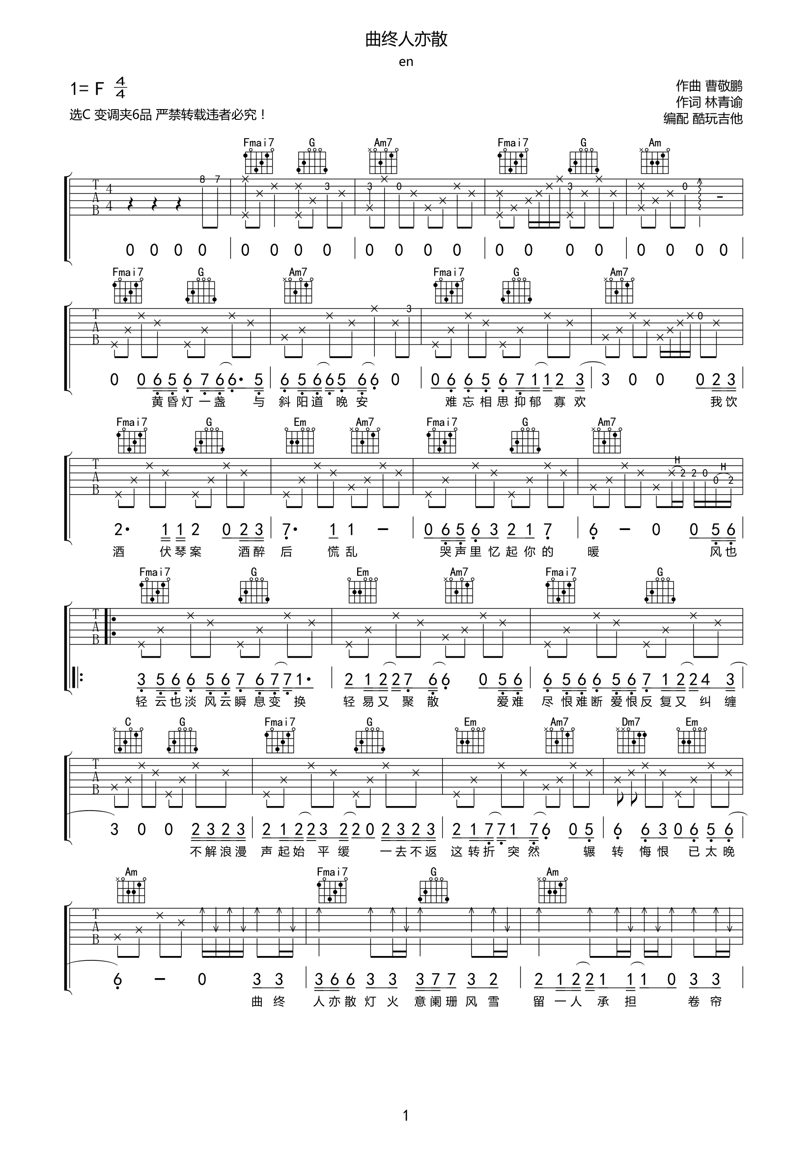 en《曲终人亦散》吉他谱-C调弹唱谱高清六线谱音频示范变调夹5品原调6品...