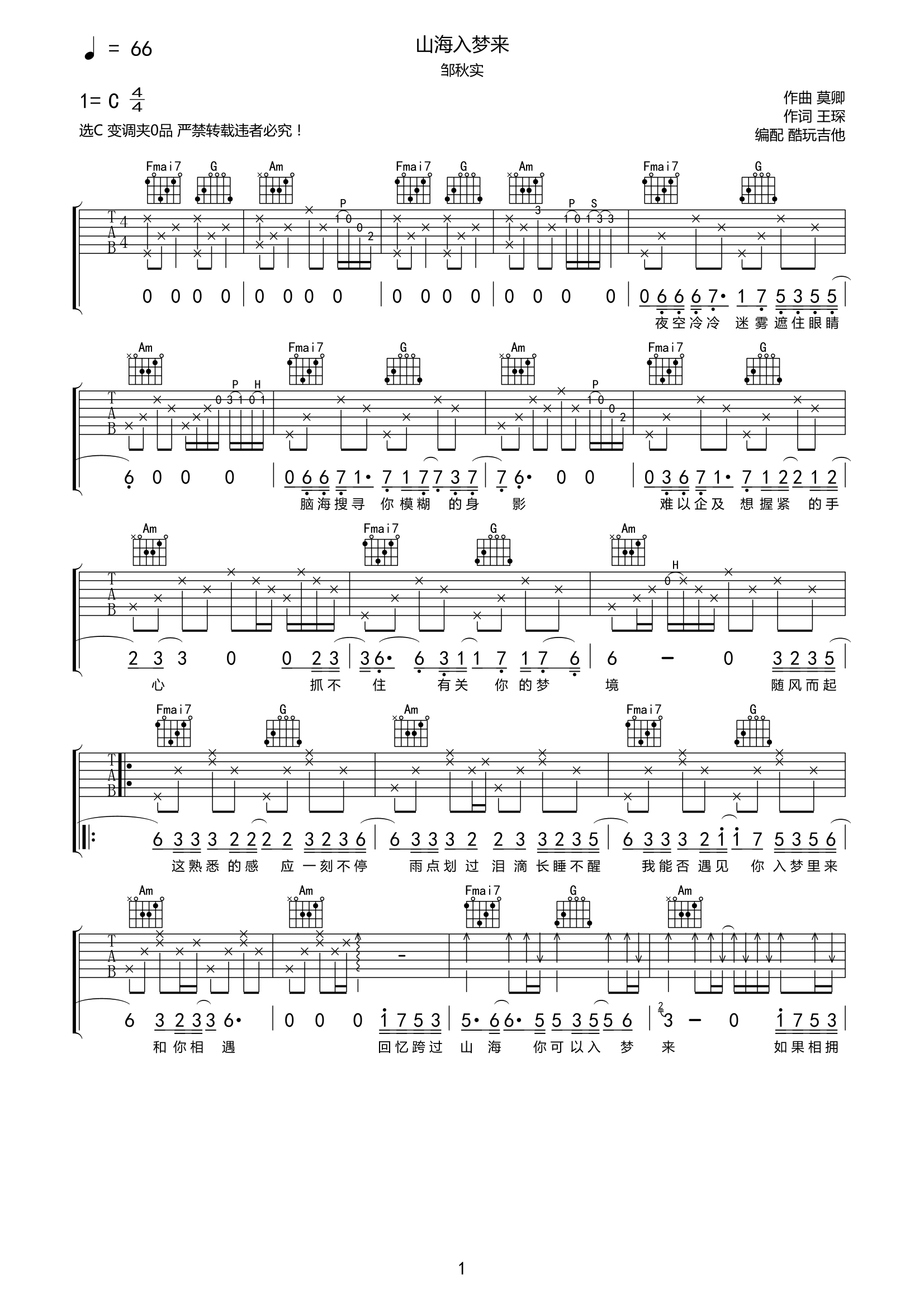 邹秋实《山海入梦来》吉他谱-C调弹唱谱高清六线谱...
