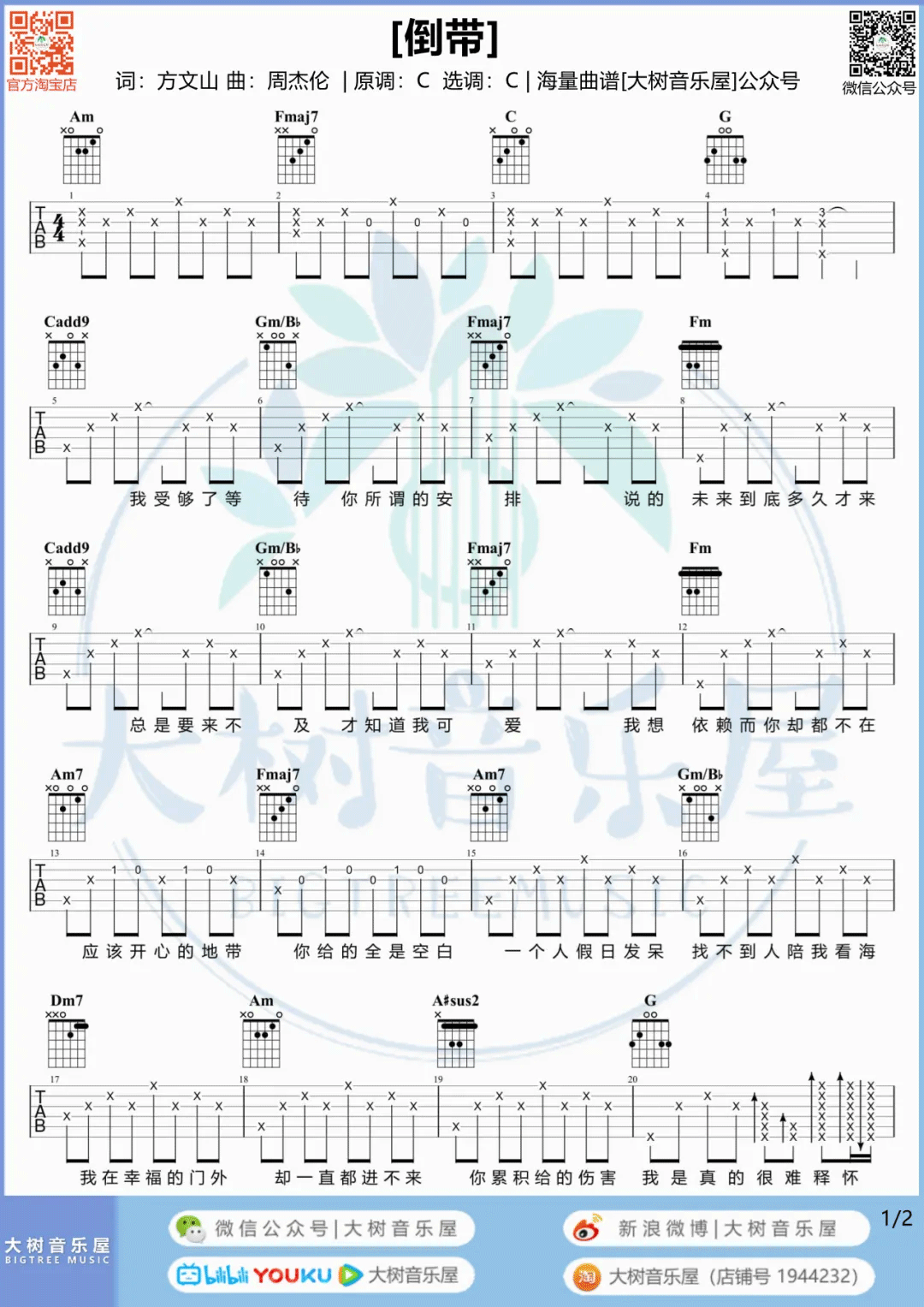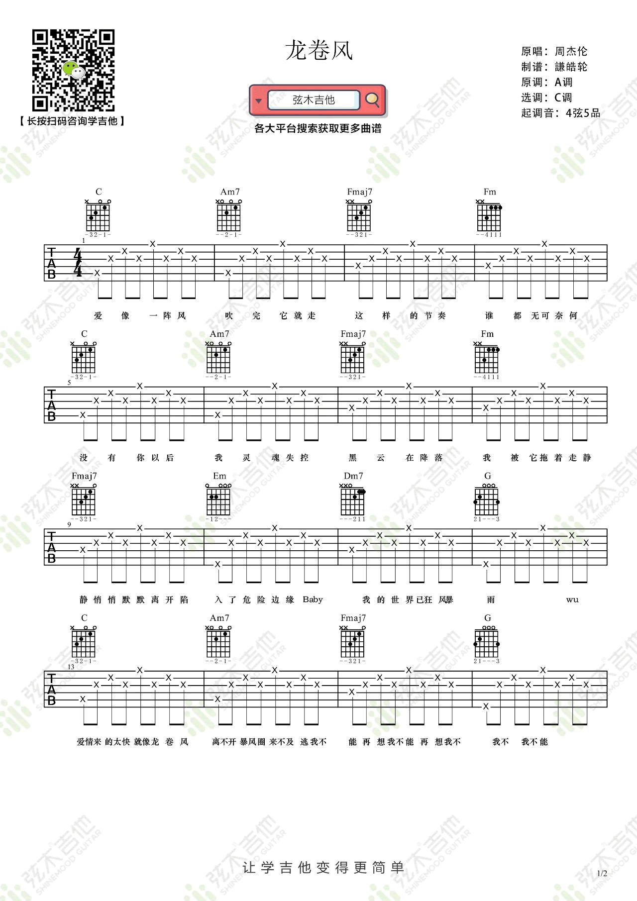 周杰伦《龙卷风》吉他谱C调简单版六线谱...