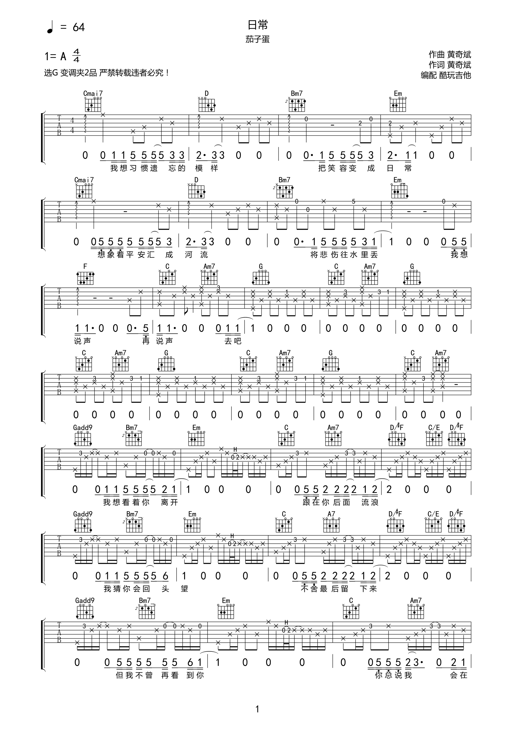 茄子蛋《日常》吉他谱-G调弹唱谱高清六线谱...