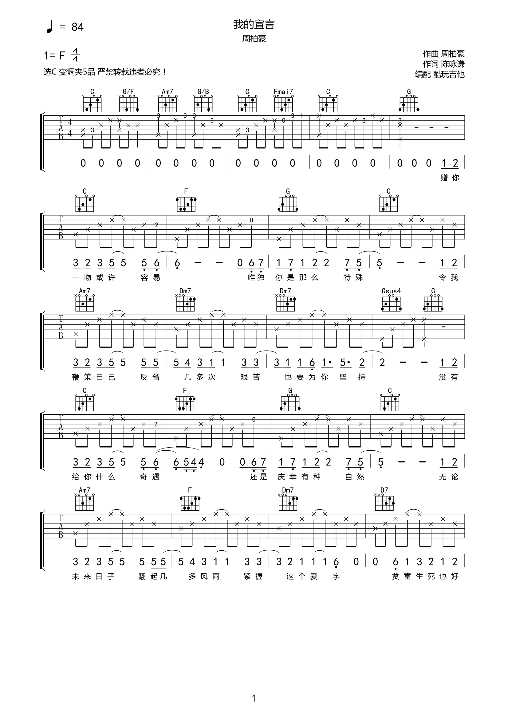 吉他周柏豪《我的宣言》吉他谱-C调弹唱谱高清六线谱