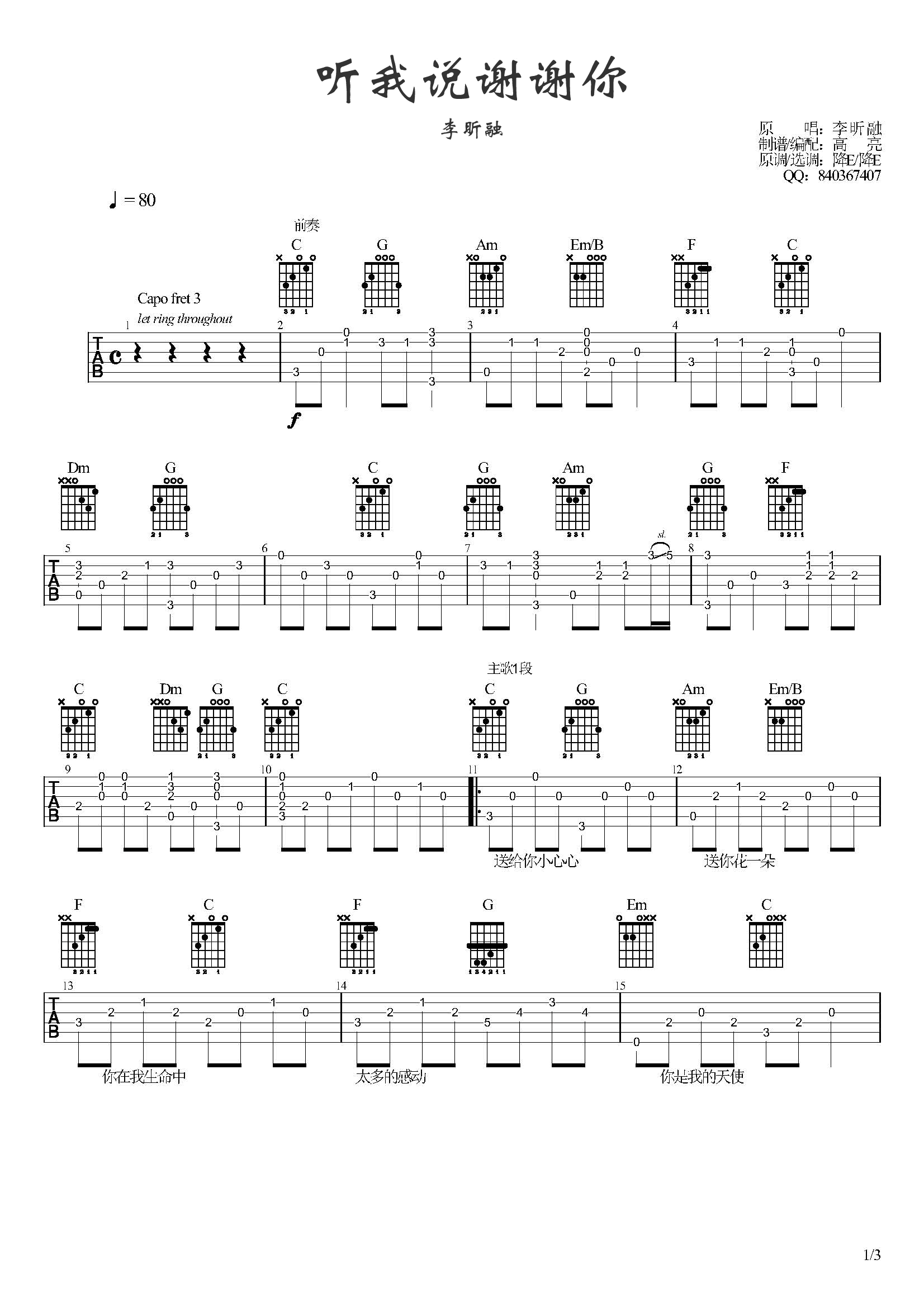 李昕融《听我说谢谢你》吉他谱C调弹唱六线谱...