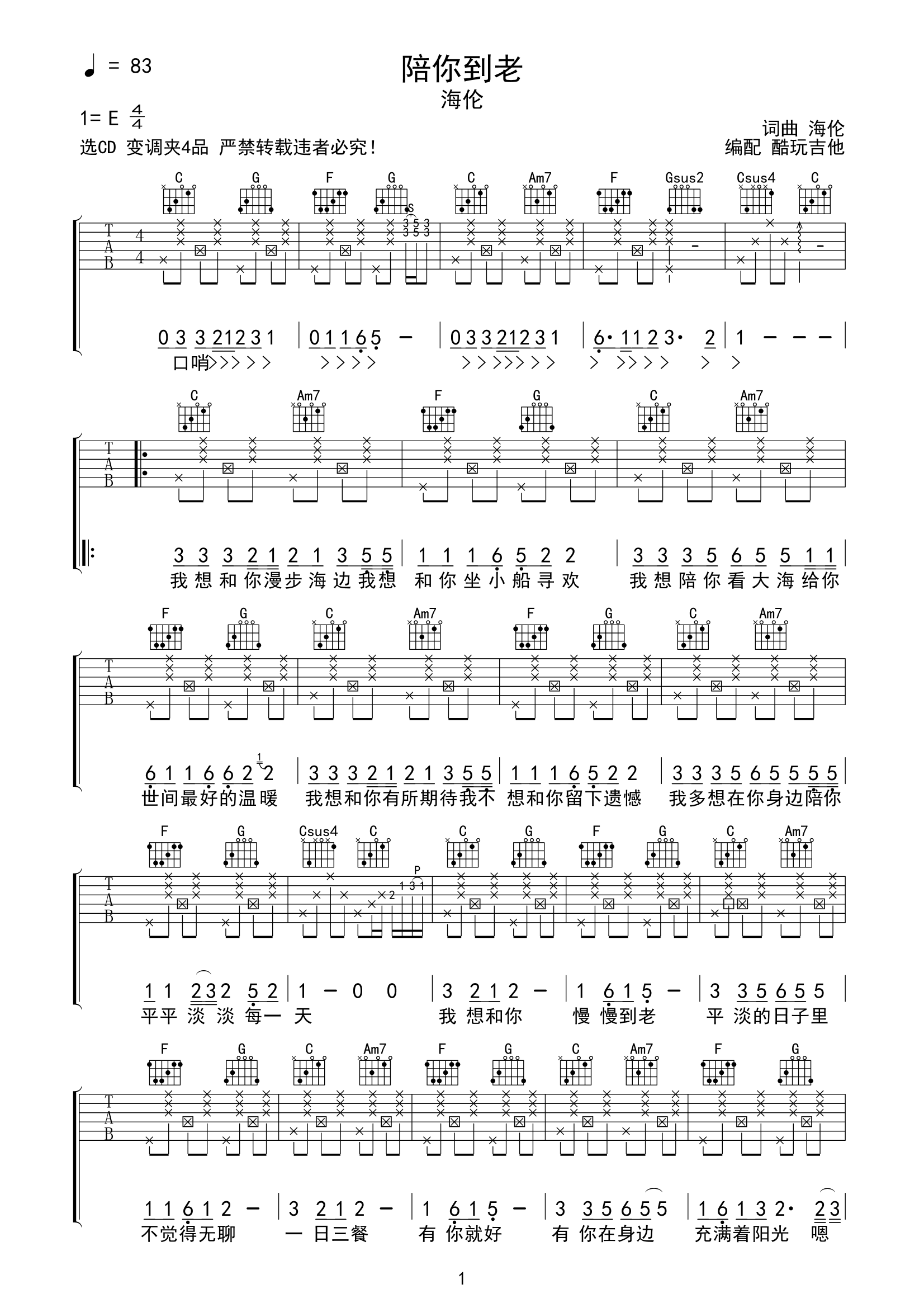 陪你到老吉他谱海伦-C调弹唱谱高清六线谱...