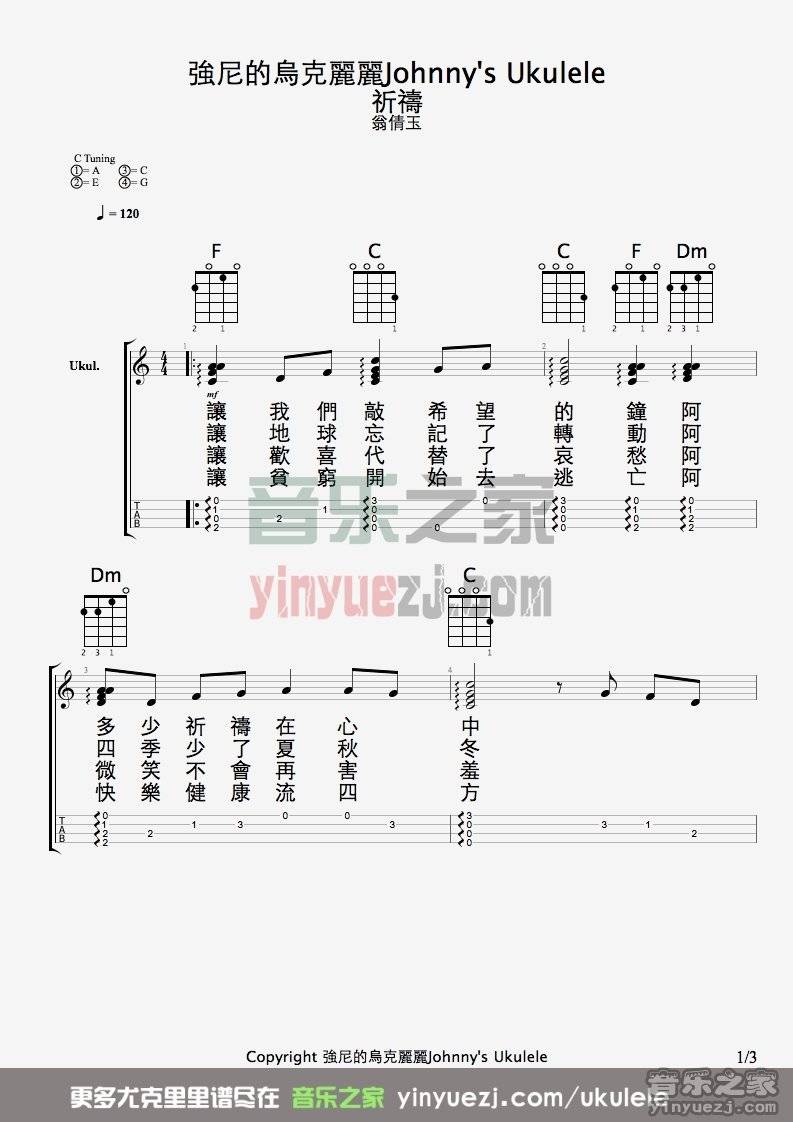 吉他翁倩玉《祈祷》尤克里里弹唱谱