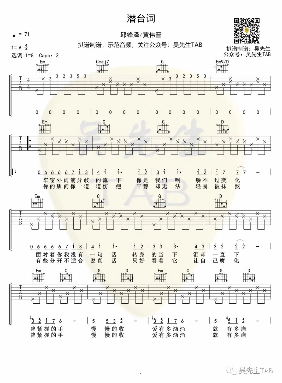 邱锋泽/黄伟晋《潜台词》吉他谱G调原版弹唱谱...