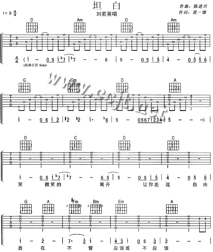 刘若英《坦白》吉他谱D调弹唱六线谱...