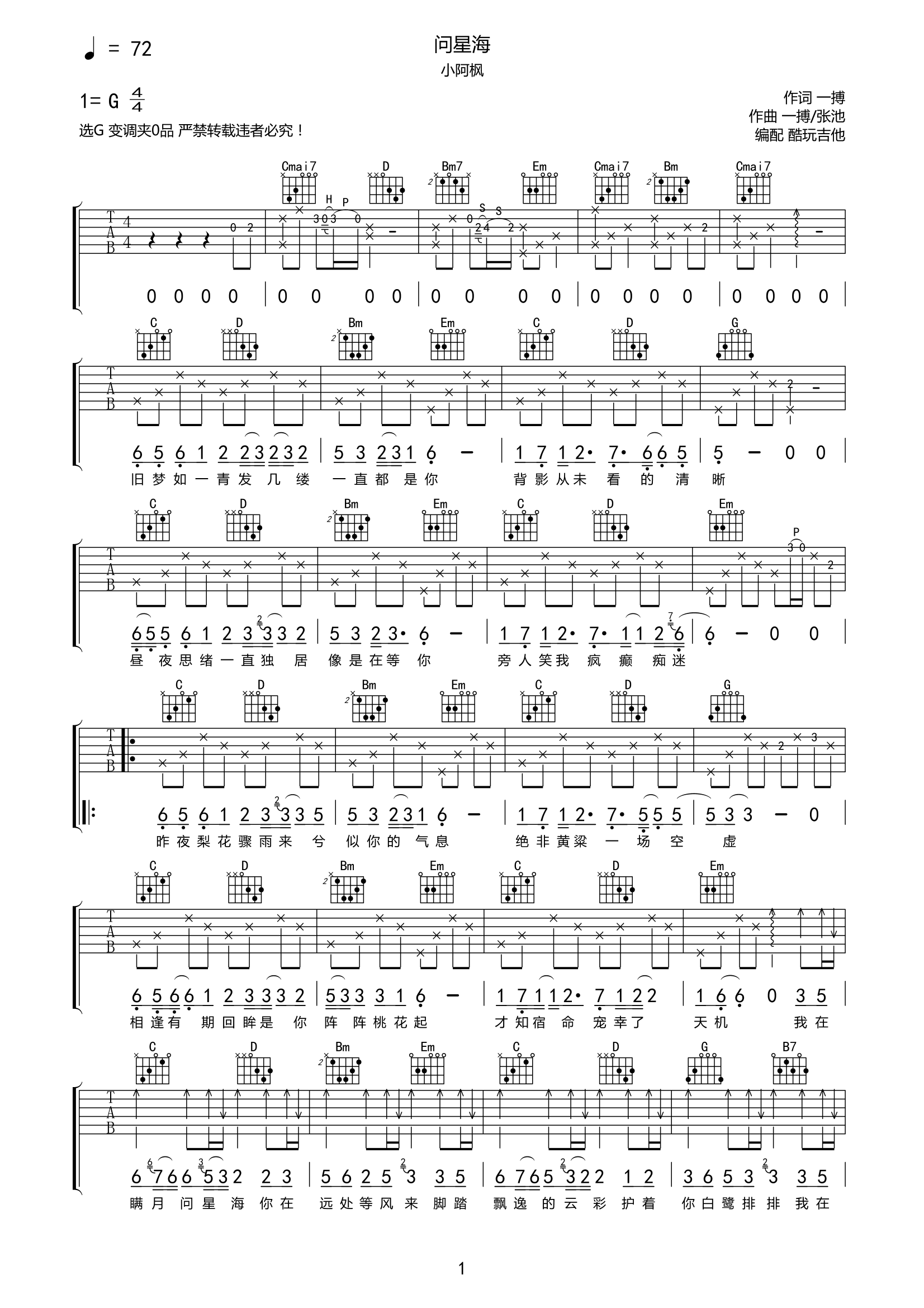 问星海吉他谱小阿枫-G调弹唱谱高清六线谱...