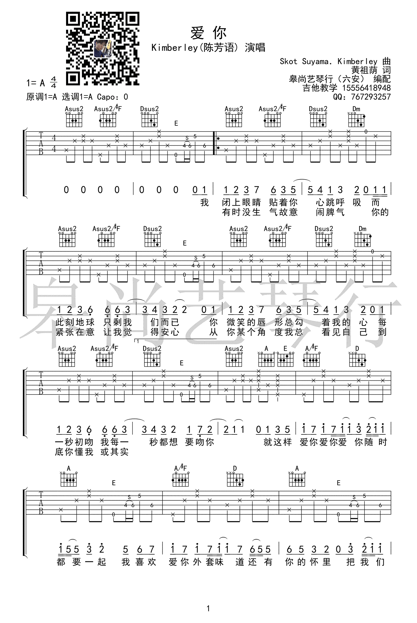 陈芳语《爱你》A调弹唱六线谱...