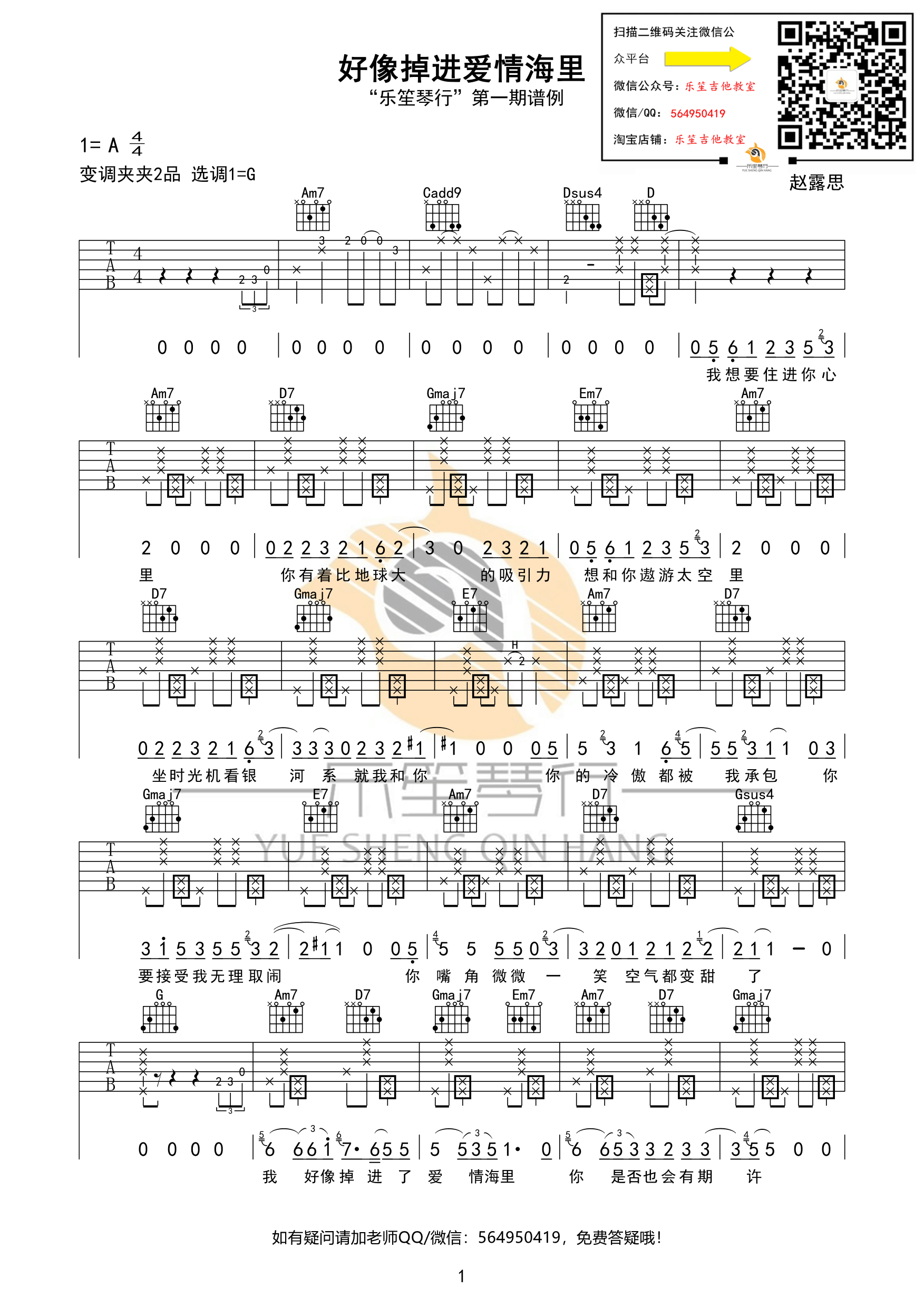赵露思《好像掉进爱情海里》吉他谱G调六线谱...