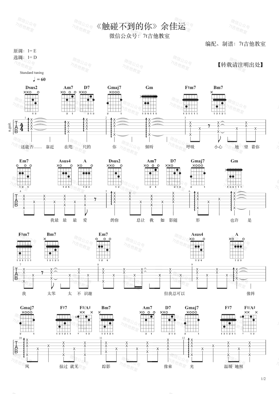 吉他余佳运《触碰不到你》吉他谱 D调弹唱六线谱
