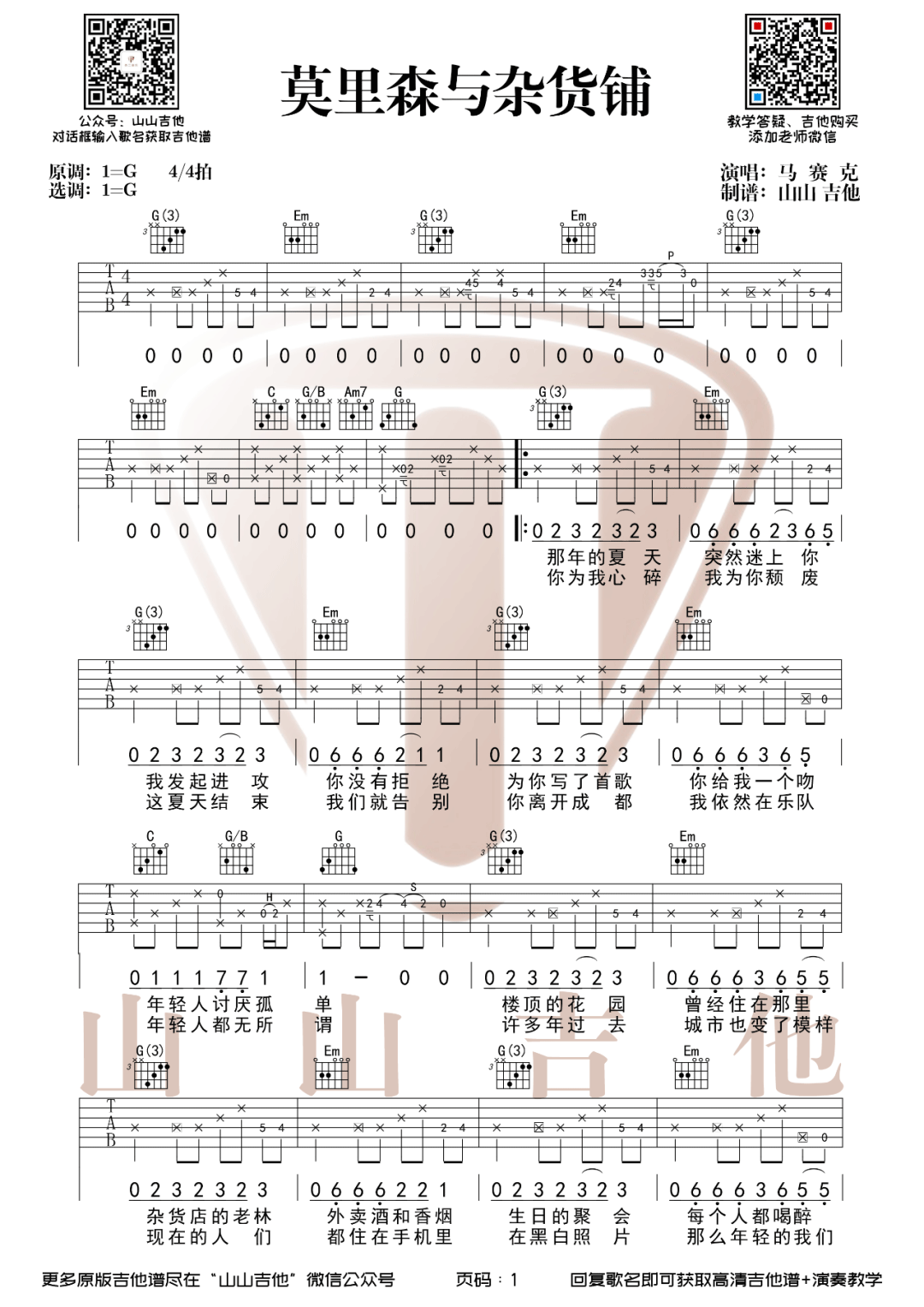 吉他马赛克乐队《莫里森与杂货铺》吉他谱 G调弹唱谱