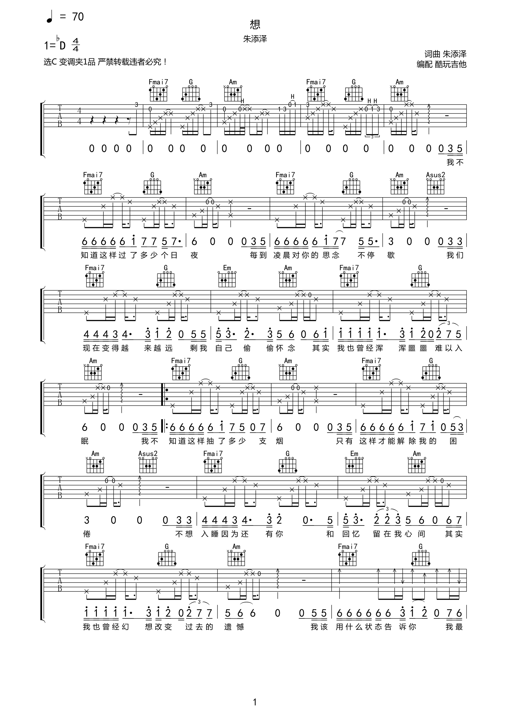 吉他想吉他谱朱添泽-C调弹唱谱高清六线谱