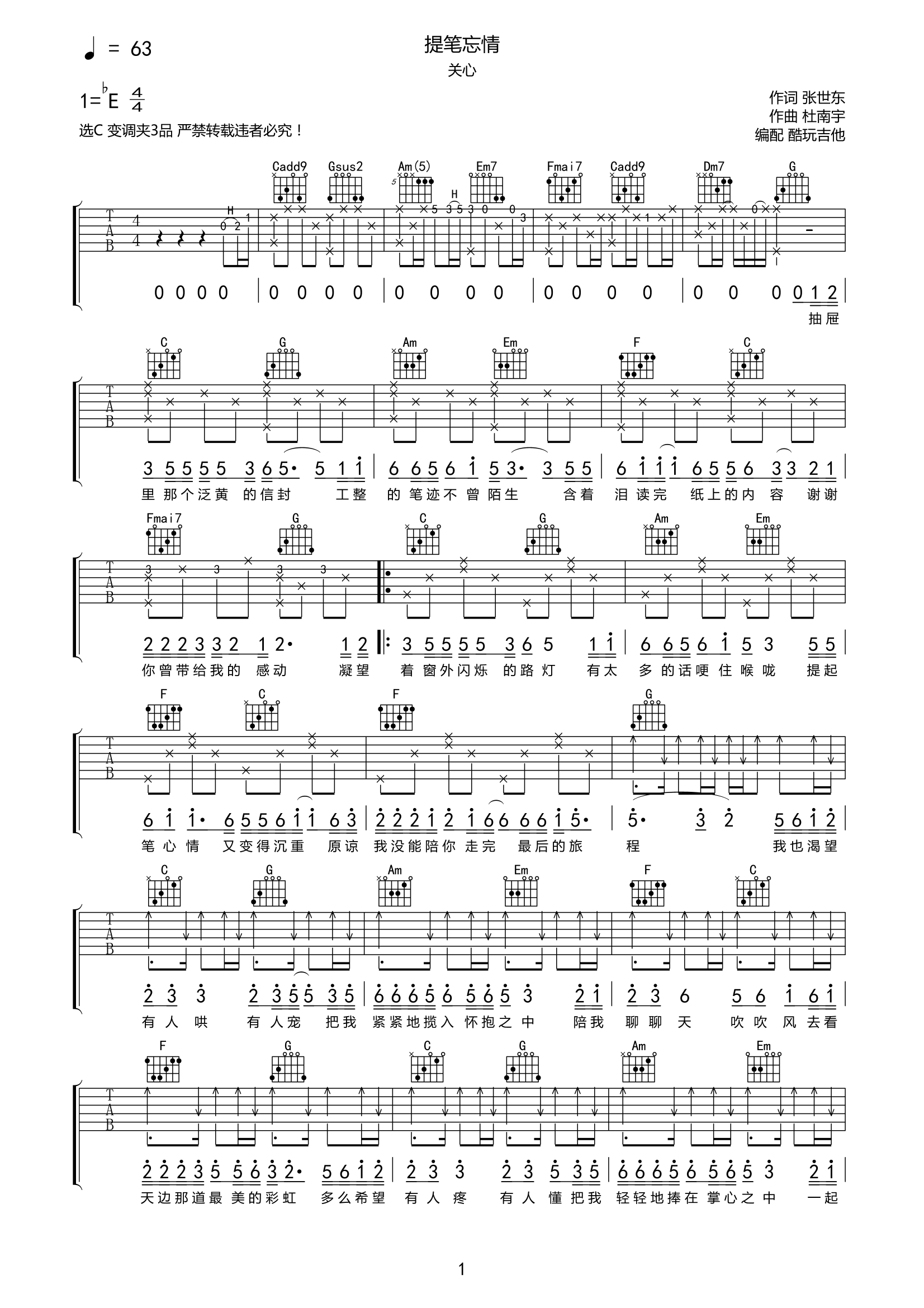 提笔忘情吉他谱关心-C调弹唱谱高清六线谱...