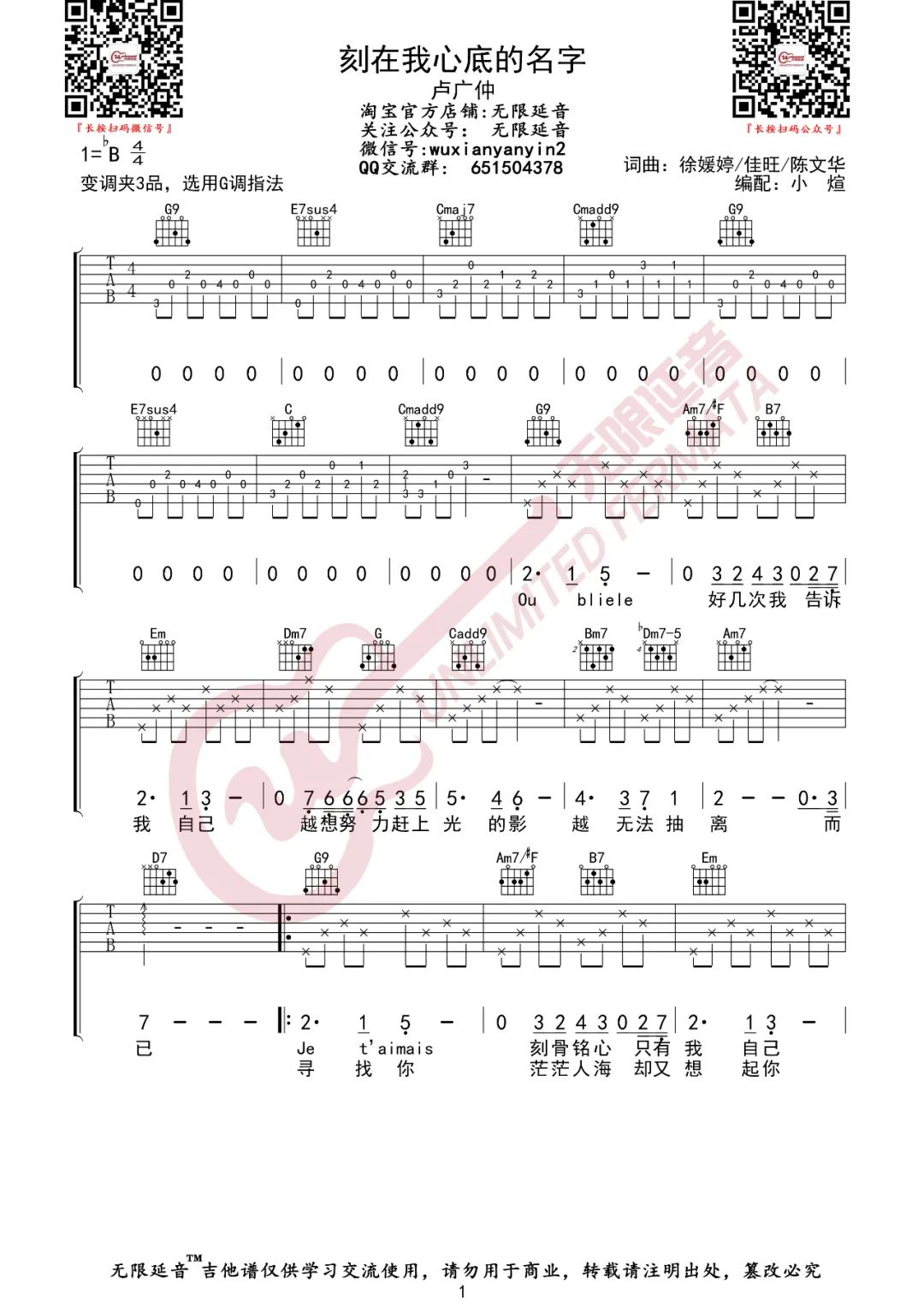 吉他卢广仲《刻在我心底的名字》吉他谱 G调原版编配