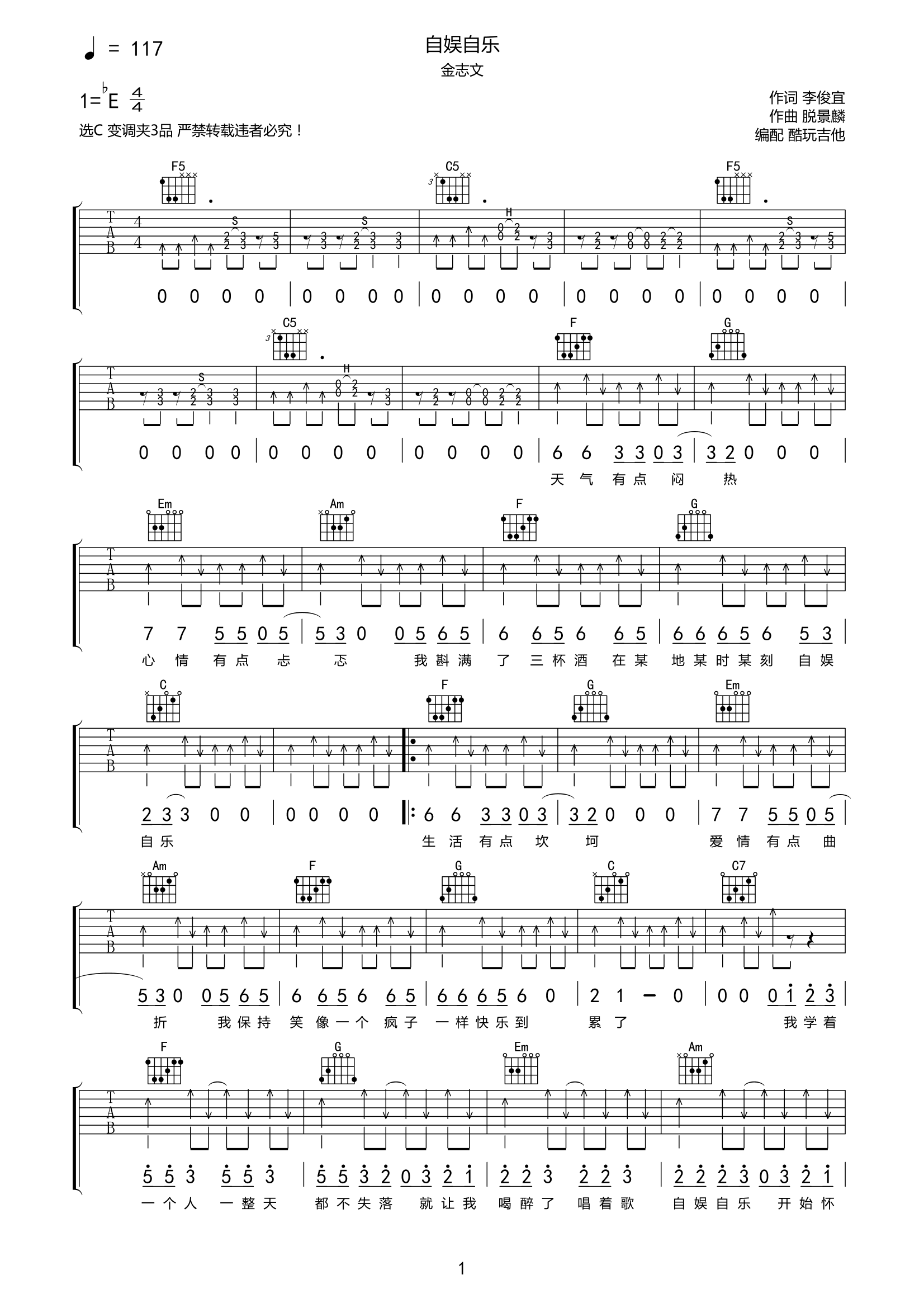 自娱自乐吉他谱金志文-C调弹唱谱高清六线谱...