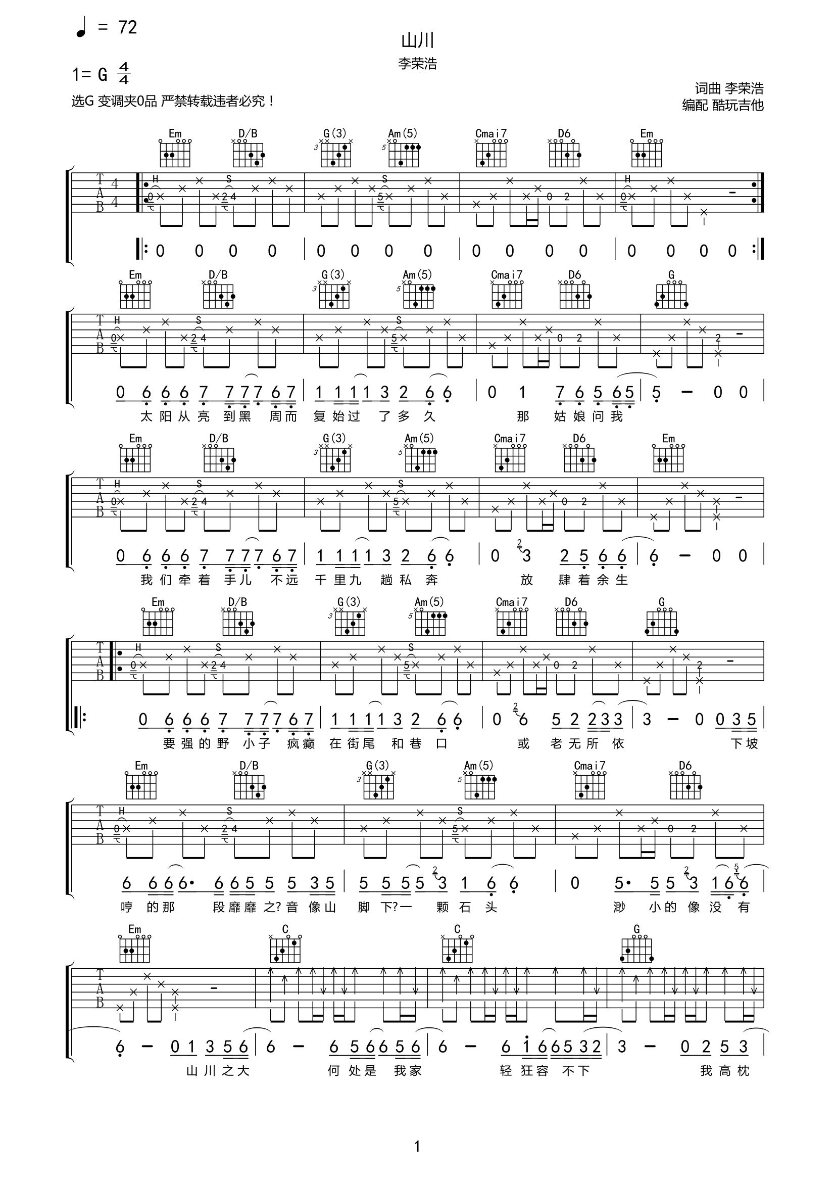 山川吉他谱李荣浩-G调弹唱谱六线谱...