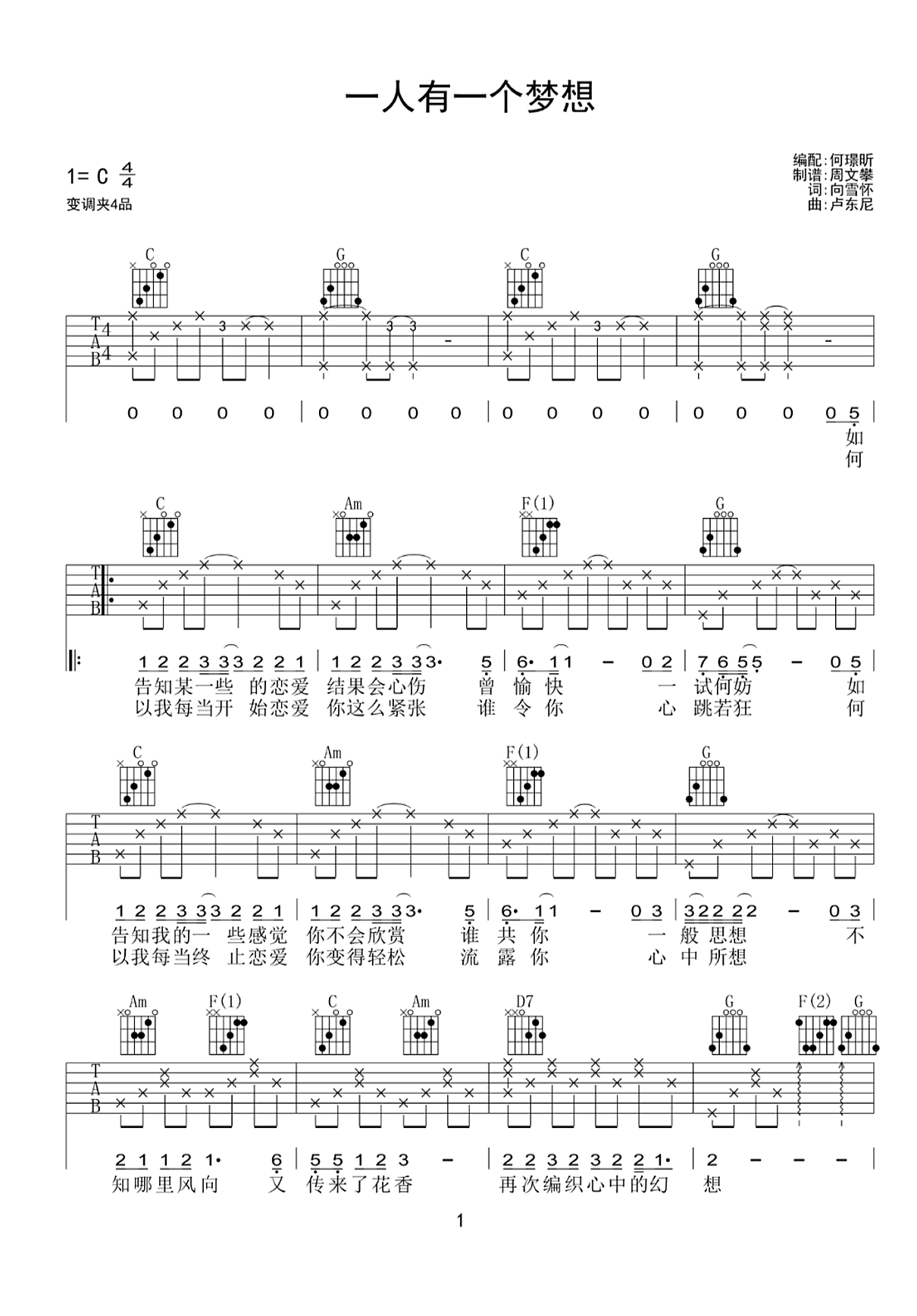 黎瑞恩《一人有一个梦想》吉他谱C调弹唱谱...
